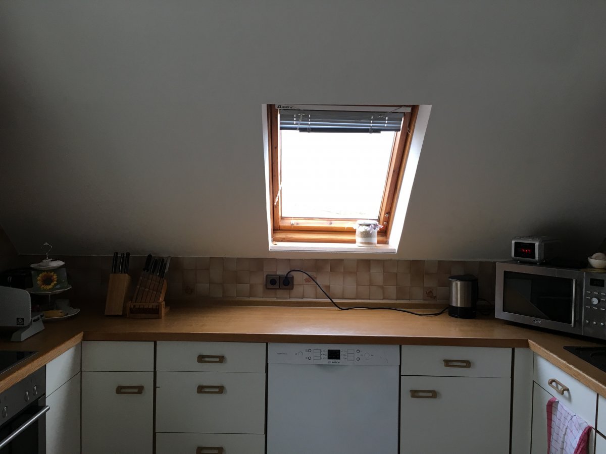 Mir kam noch eine Idee (der Raum lies mir keine Ruhe). Die Fensterzeile deutlich übertief planen (evtl. auch mit übertiefen US - das ist aber budgetabhängig), das schafft Kopffreiheit zur Schräge. Insgesamt wäre dadurch die Zeile 85cm tief. Wasser wieder auf Putz ums Eck verlegen, Spüle an der Fensterzeile, GSP neben der Tür. Statt U "nur" noch ein L. Allerdings weiß ich nicht, ob es Möglichkeiten für eine DAH in der Dachschräge gibt - hier wären die Profis gefragt.