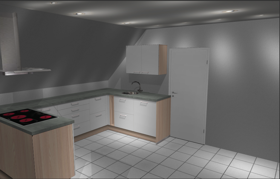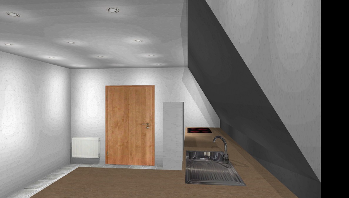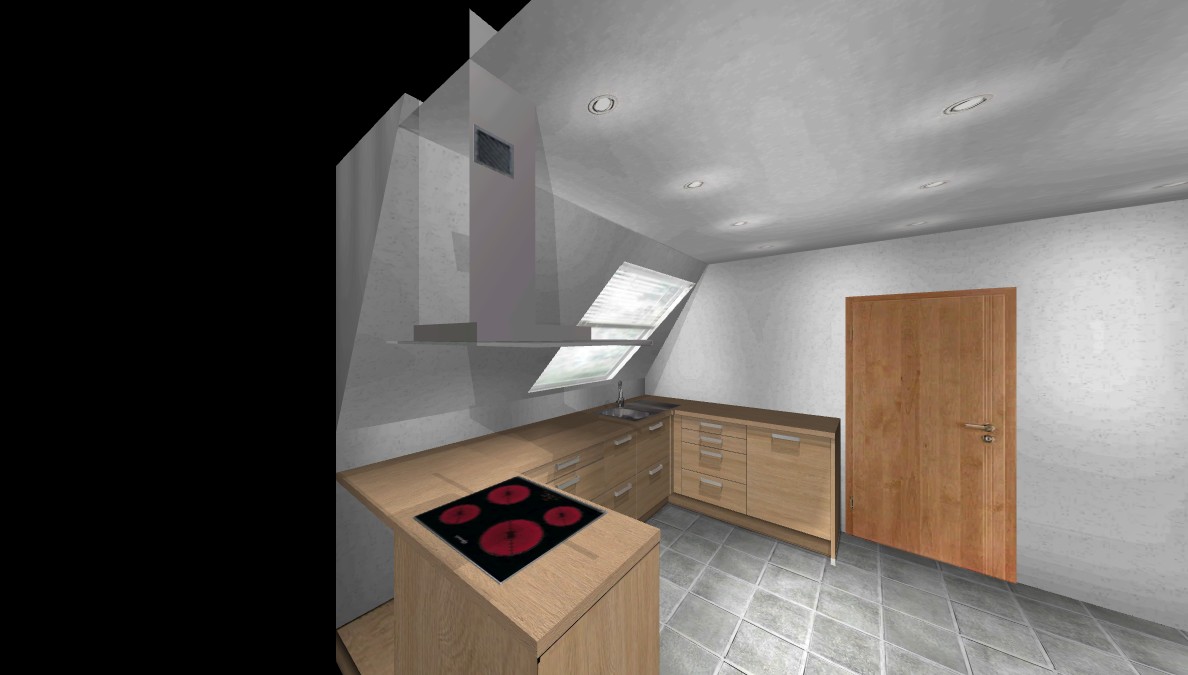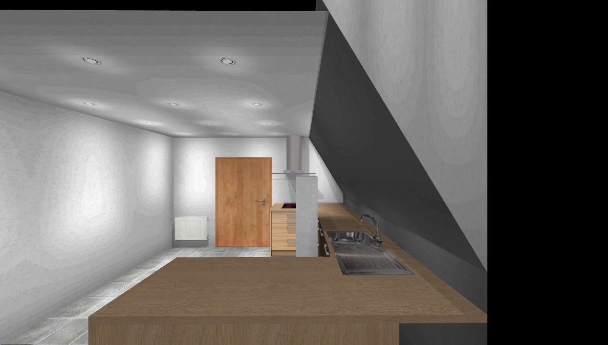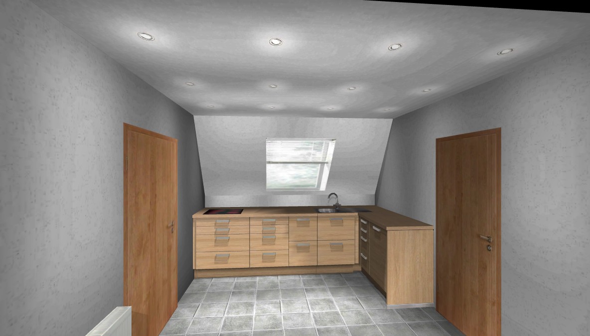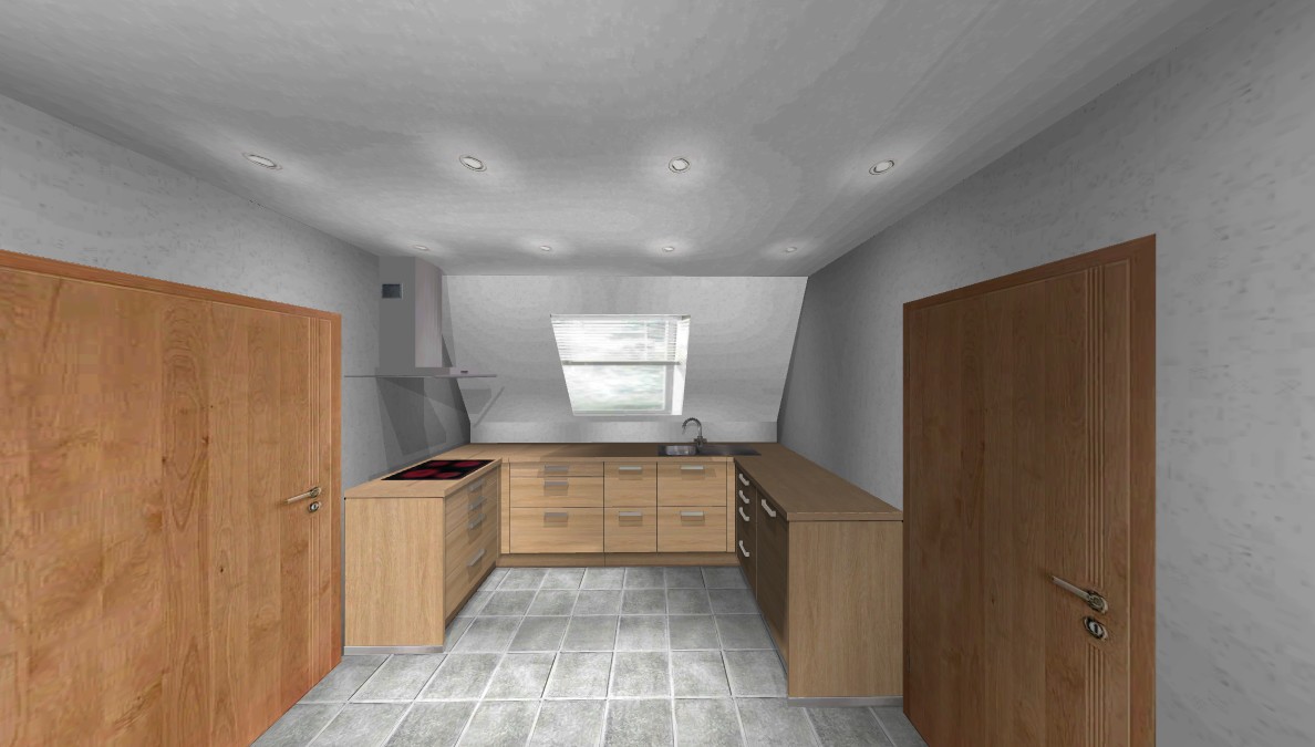 Edit: Ich habe versucht, anfangs ein U mit übertiefer Zeile zu planen, um mehr Kopffreiheit an der Schräge zu bekommen. Allerdings wurde der Platz für ein KF zu klein.