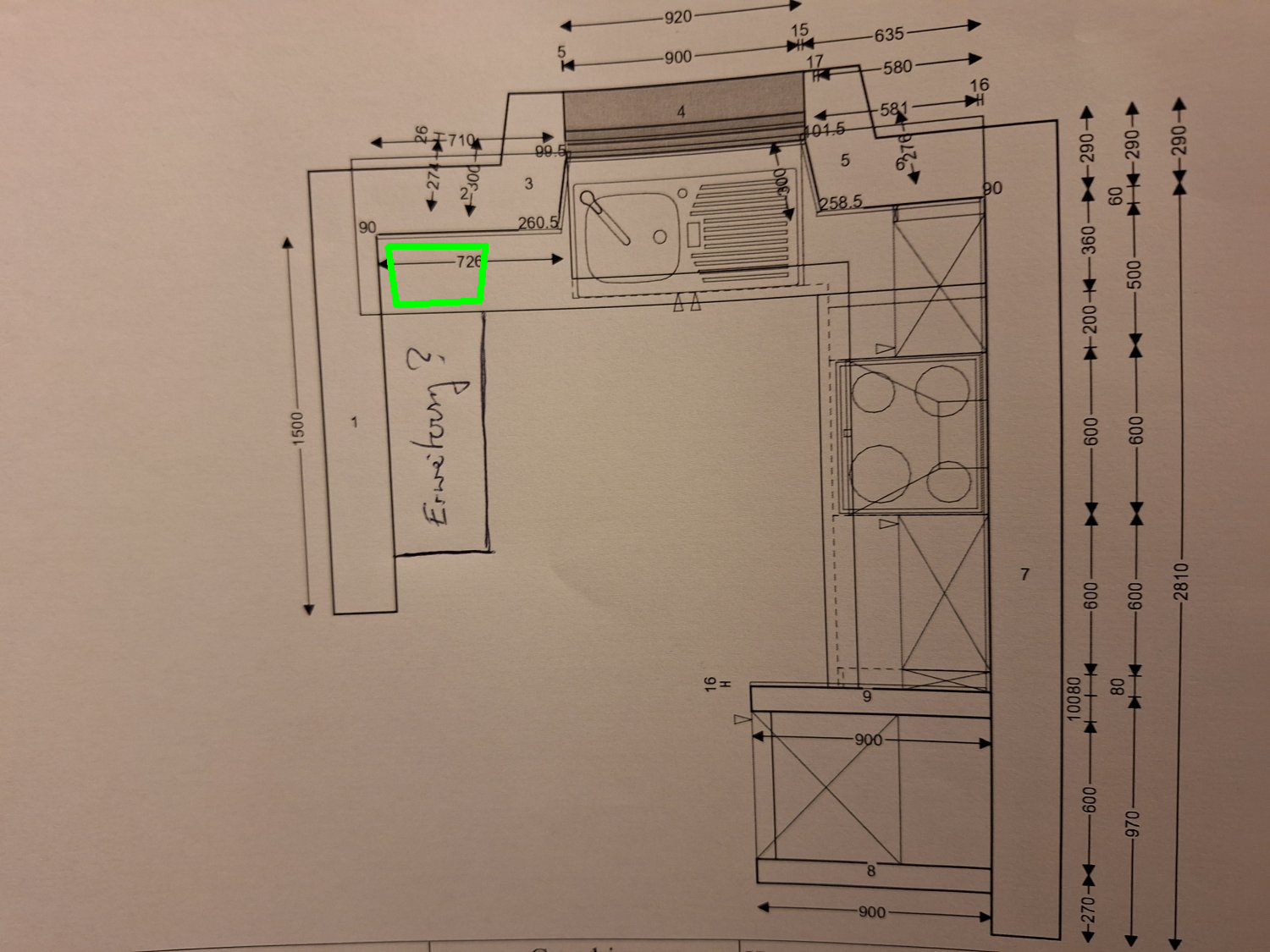 Hier ein Bild. In dem Grün markierten Bereich steht aktuell kein Unterschrank . Es war ein Waschmaschinenplatz vorgesehen. Es handelt sich um eine Ferienwohnung und wir wollen keine Waschmaschine mehr in der Küche um den Platz sinnvoller zu nutzen. Mehr Stauraum und mehr Arbeitsfläche .