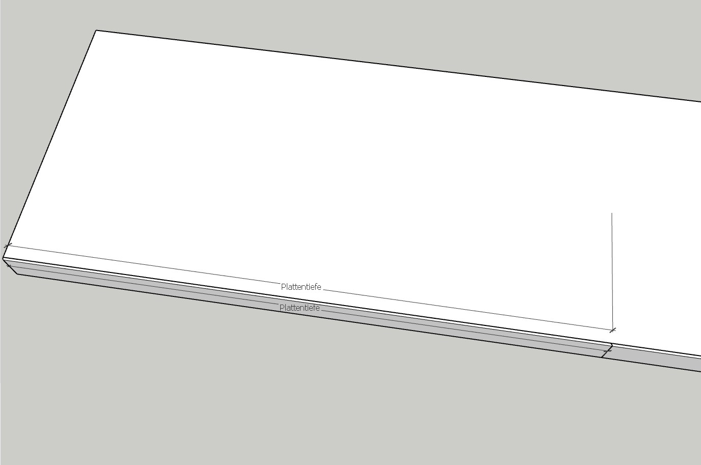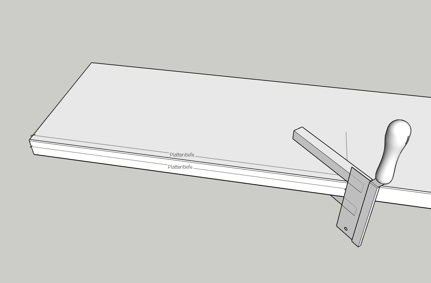Zunächst ermittelst du die Plattentiefe und zeichnest die auf der Kante genau an (am Beispiel ist die Plattentiefe 60cm