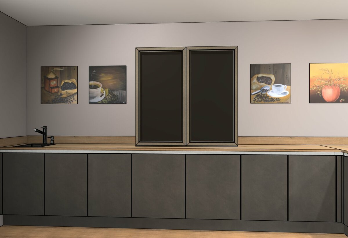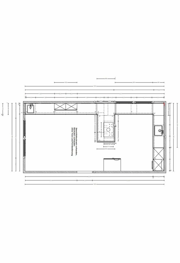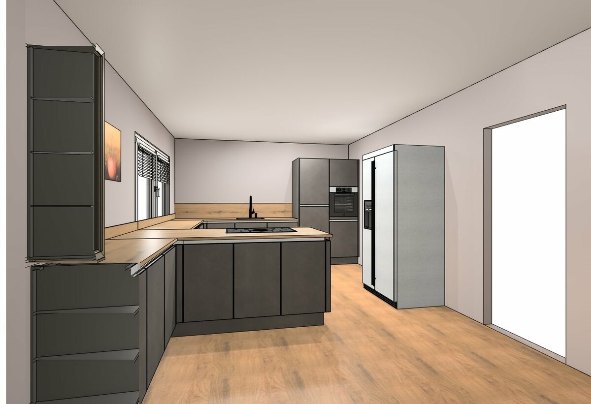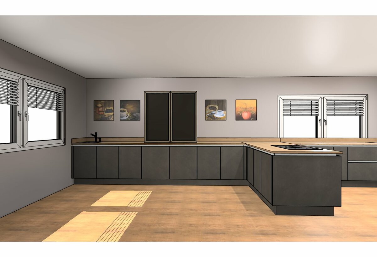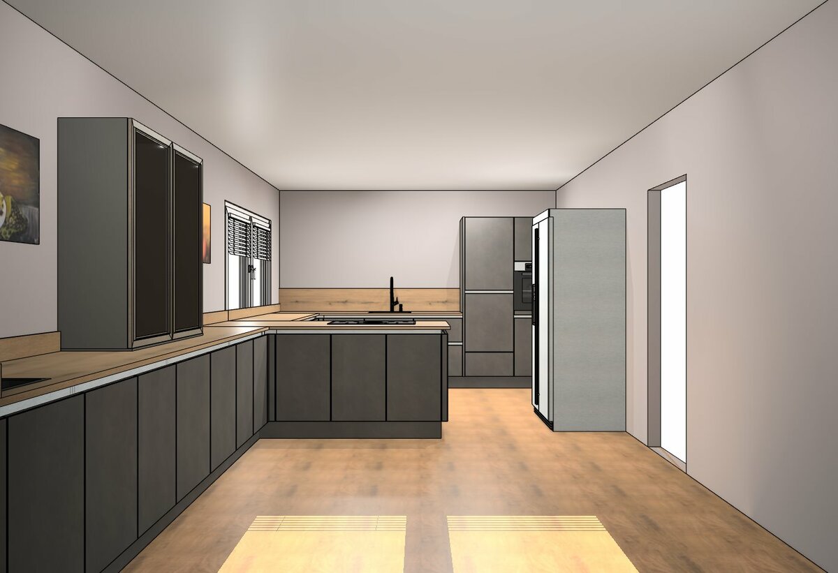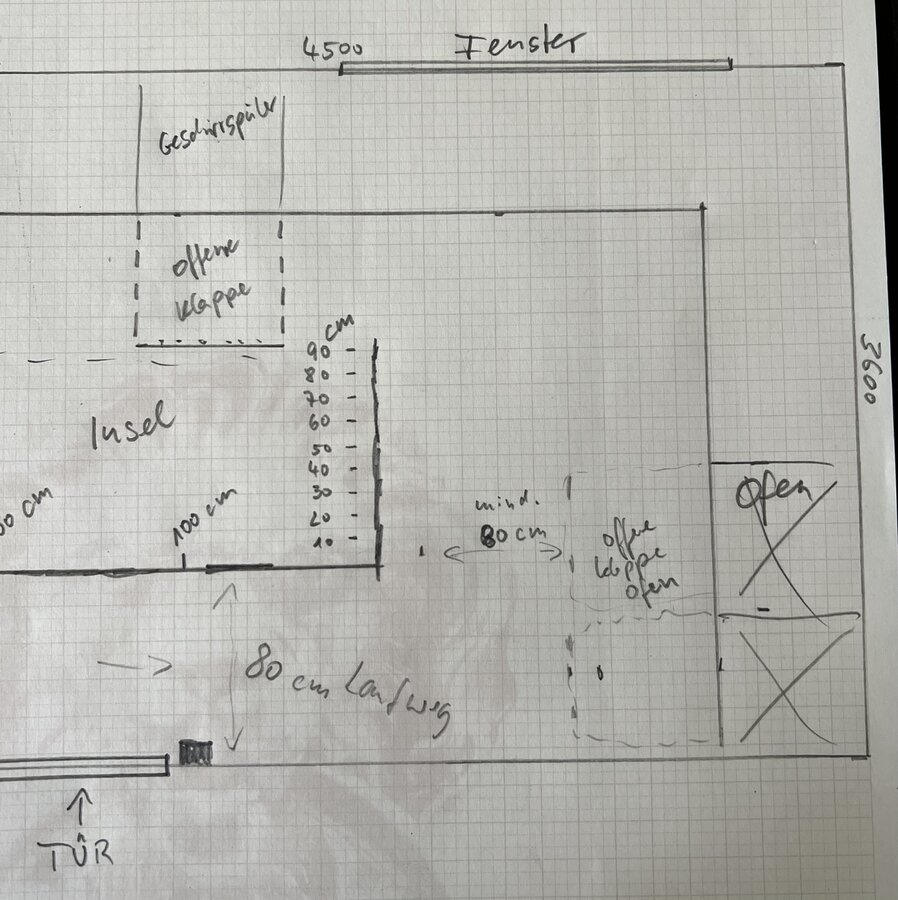 Küche und Essen sind jetzt ein Raum, die Wand dazwischen habe ich entfernt. Es stehen dort allerdings an beiden Seiten ein "verkofferter Wandstummel" also quasi eine Säule an der Wand mit einem Maß von circa 20 x 20 cm, die bekomme ich auch nicht weg, da sind Heizung, Lüftunge und sonstige Leitungen drin. Kann der Küchenbauer aber wohl ohne Probleme in der Arbeitsplatte einbauen, da dort kein Eckschrank geplant ist.