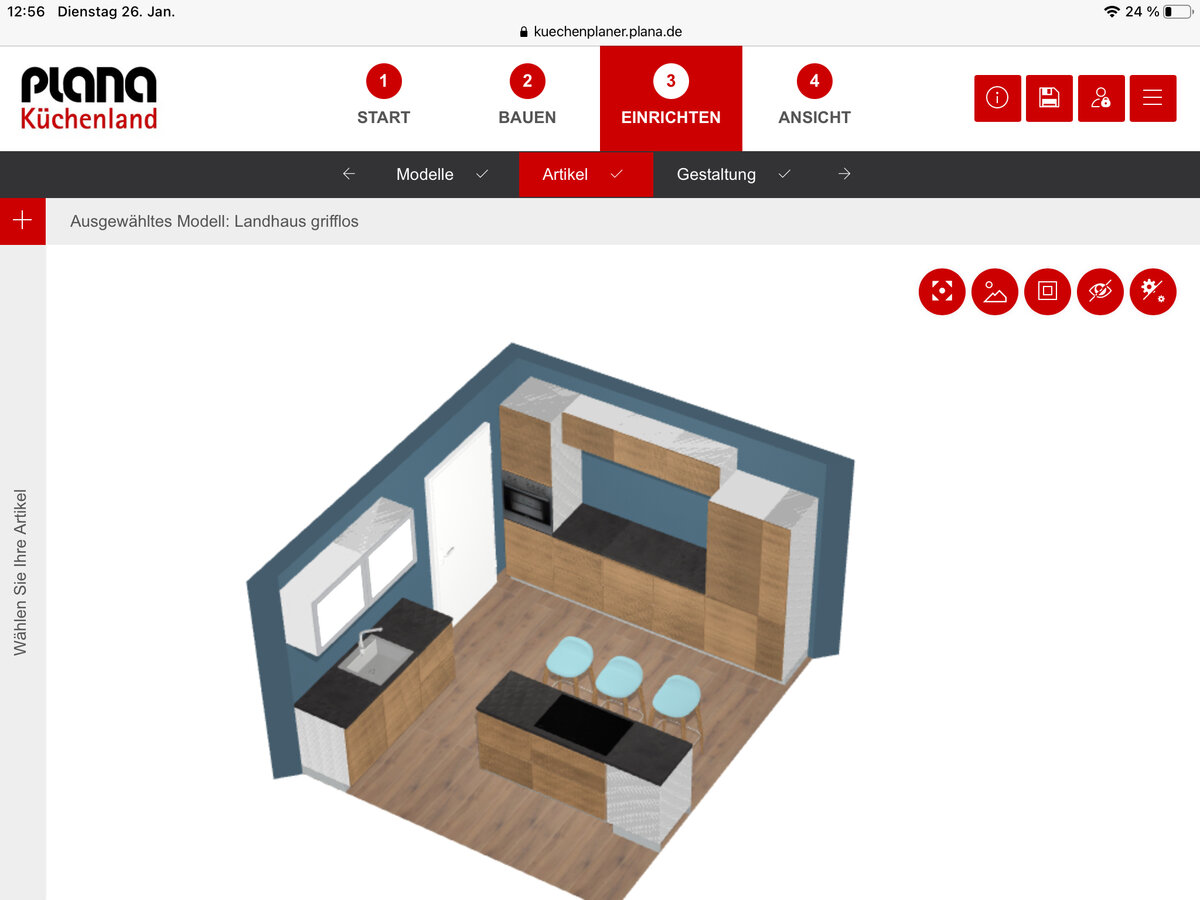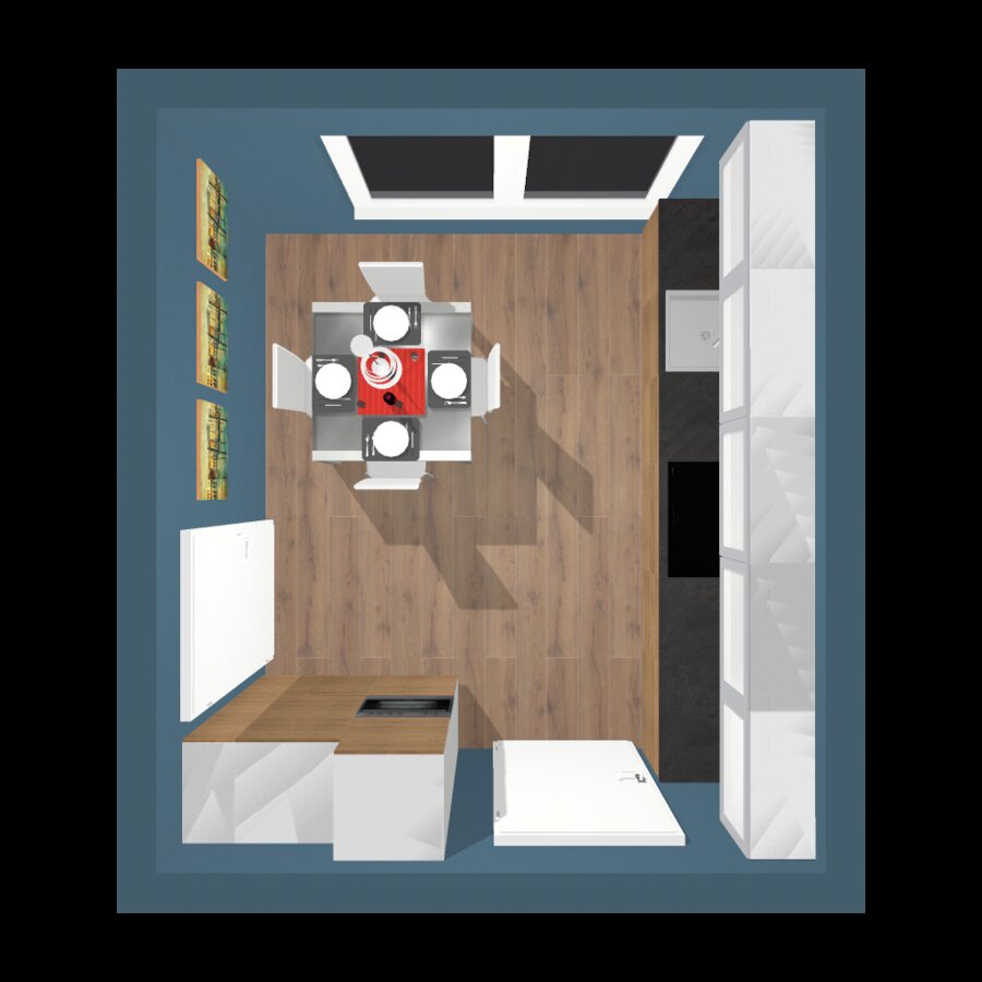 Der Tisch dient nur als Platzhalter, wir würden einen nehmen wo man zu zweit nebeneinander sitzen kann. Die Türen können sich umgebaut werden so das sie nicht ins die Küche öffnen oder gegen Schiebetüren getauscht werden.
