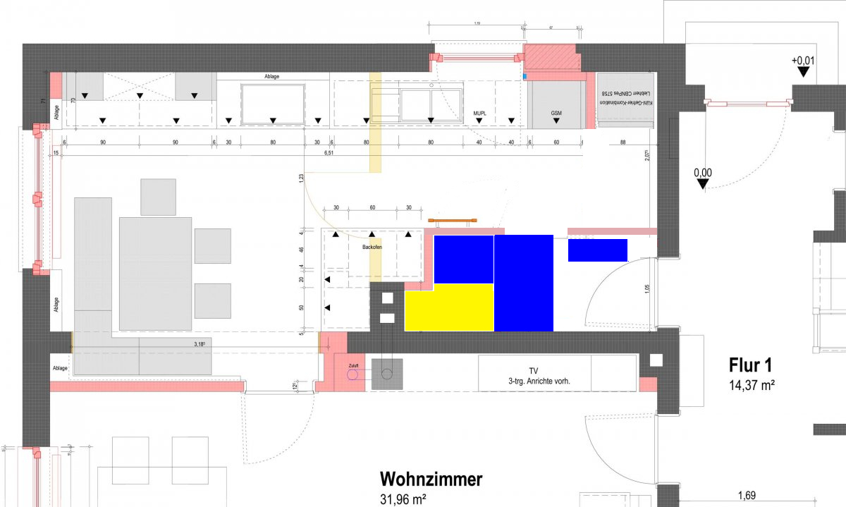 Anbei mal deine letzte Planung. Hinter dem Kühli ist nun ein großer Hohlraum. Gelb im Bild. Fläche Speisekammer ist blau markiert.