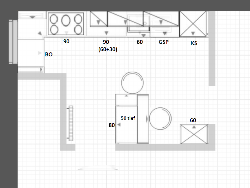 Bei der geplanten Ofen position befürchte ich, dass er schwer zu nutzen ist, da man links von der Wand und rechts von der Küche eingeengt ist. Wenn ich meinen Ofen benutze, stehen meine Ellbogen zur Seite ab, da könnte man hier anstoßen.