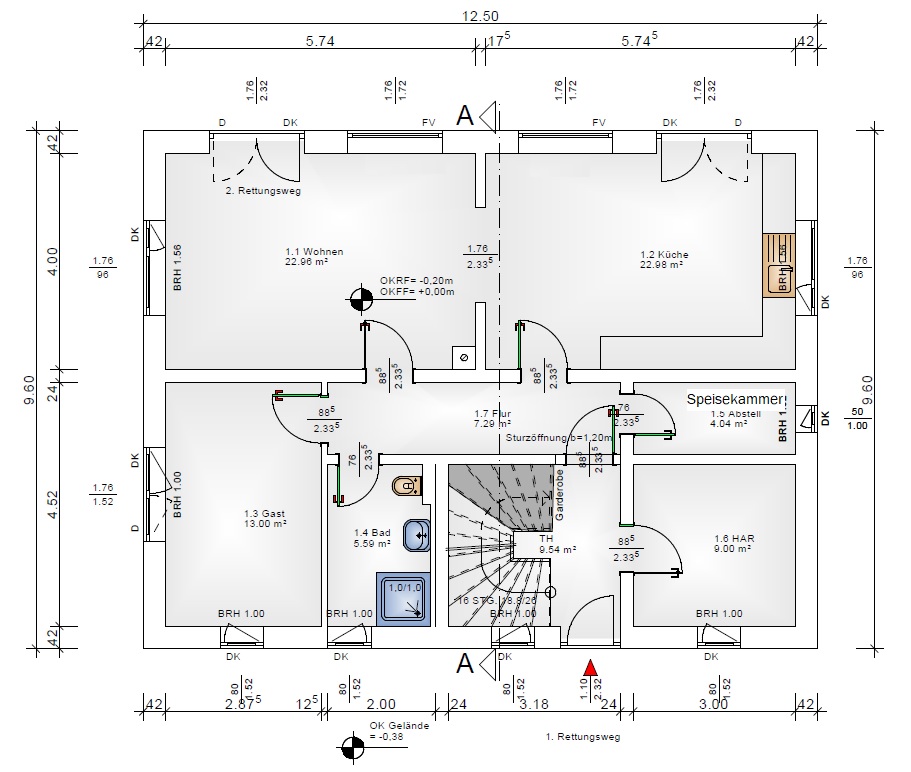 Ich habe den Grundriss vom EG angefügt. Die Türen und Fenster würden sich noch verschieben lassen, die Anschlüsse noch frei wählbar. Ist die BRH von dem westlichen Fenster so sinnvoll? Ist es besser, die Spüle unter dem Fenster zu verbauen oder lieber wo anders? Wir hätten in der Küche/Esszimmer gerne eine Küche mit (Halb-)Insel und einen freistehenden Tisch für 6 Personen (in der Ecke am Sitzfenster). Einen Eckschrank brauchen wir nicht unbedingt, oder wäre es wegen platztechnisch doch besser?