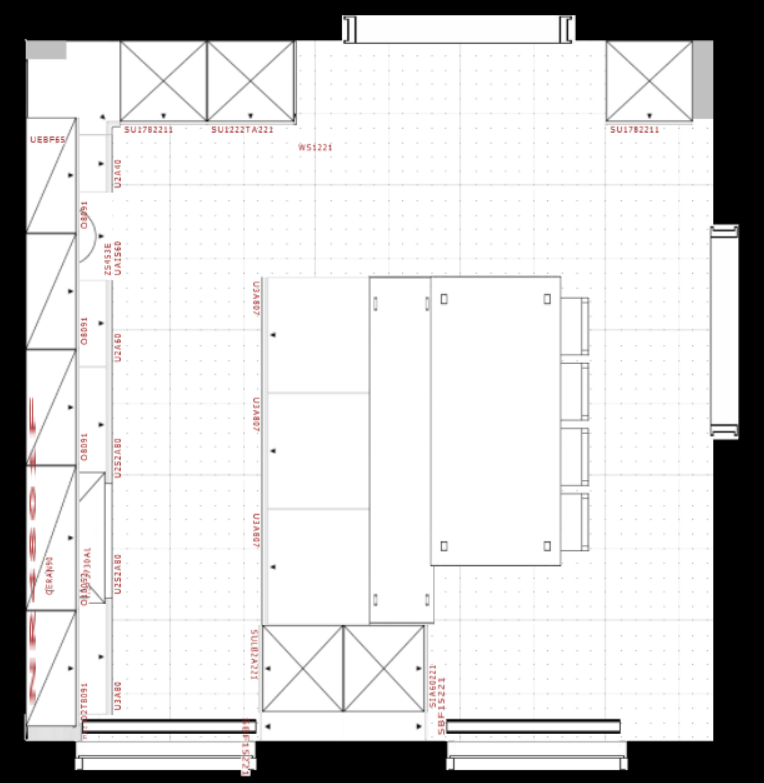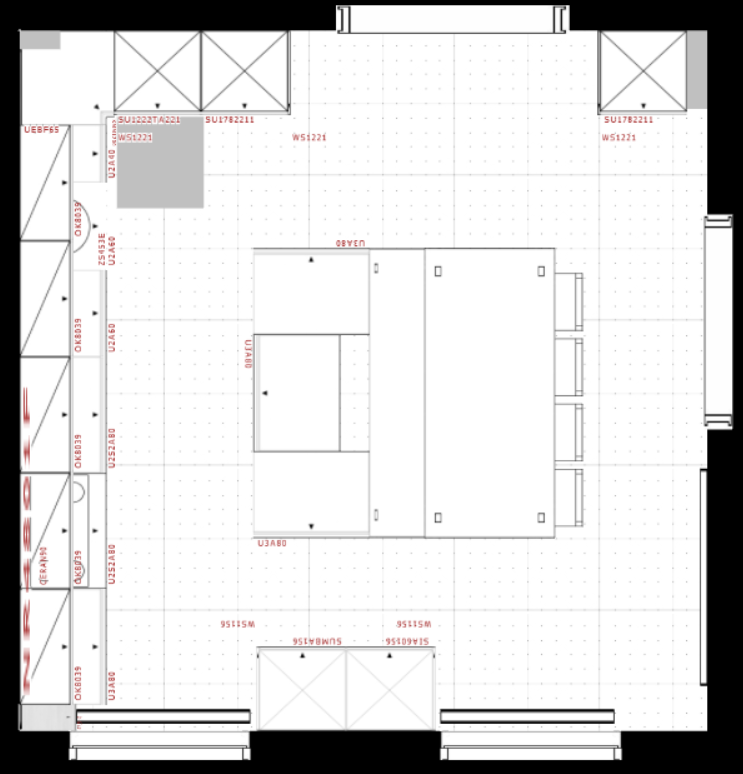 An den BO-Schrank anschließend 3 x 80er US in 75er Tiefe. Rückwärtig dazu eine 240cm Sitzbank. Davor ein 200cm Tisch und 4 Stühle.