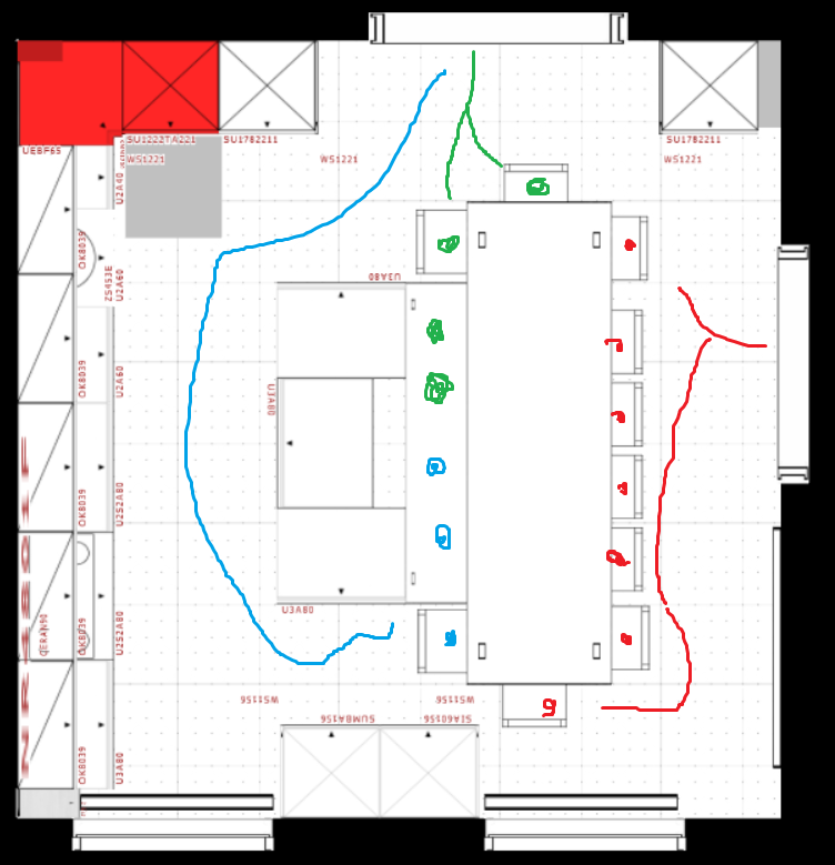 Außerdem hab ich noch mal den Tisch virtuell um 1m verlängert (50cm zu beiden Seiten) und mal eingezeichnet, wie man an die Sitzplätze kommt. Für die auf der Bank wird es ggf. fummelig, aber da dürfen dann Leute sitzen, die nicht so oft aufstehen müssen.