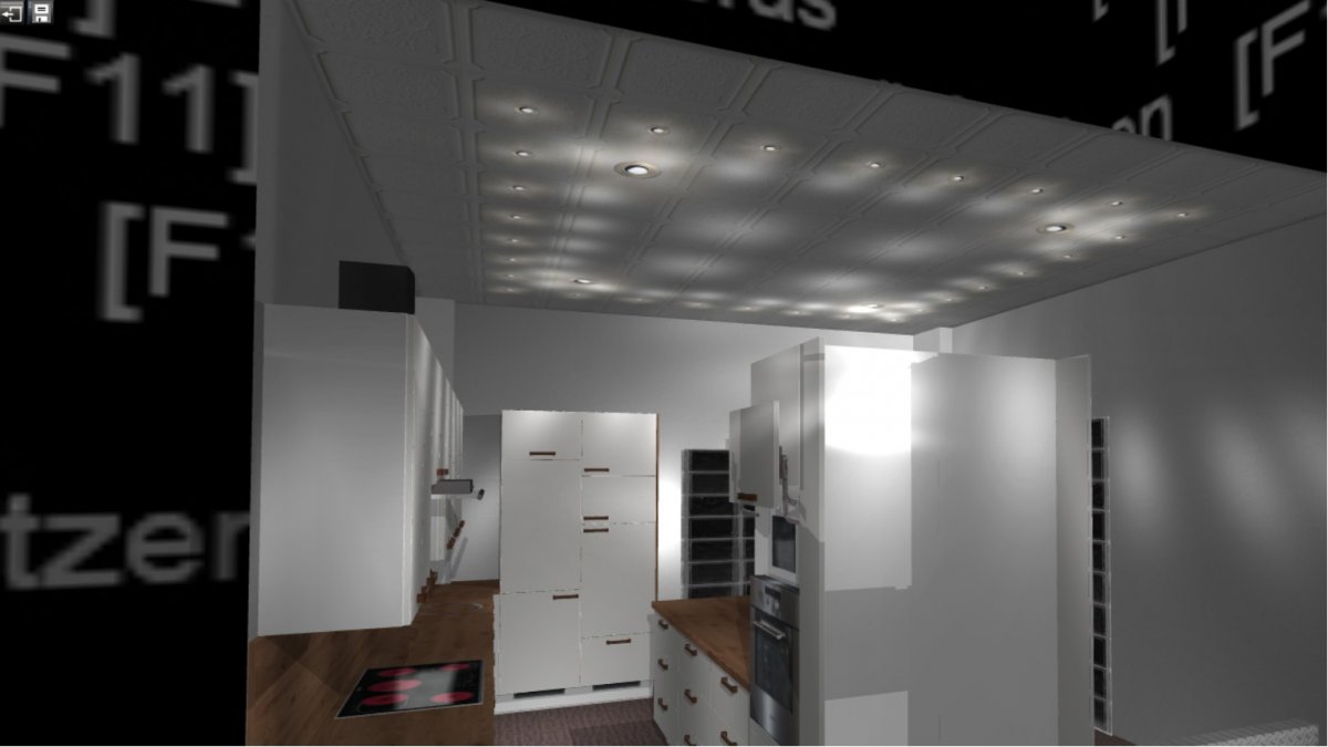 Planrechts der Tür der Gefrierschrank. Die Idee, die Schränke rechts und links der Tür mit Klappenschränken zu verbinden, finde ich toll, allerdings weiß ich nicht genau, wie hoch die Tür ist, daher kann ich noch nicht sagen, ob das wirklich funktionieren würde. Ich behalte das aber im Hinterkopf.