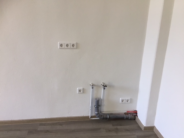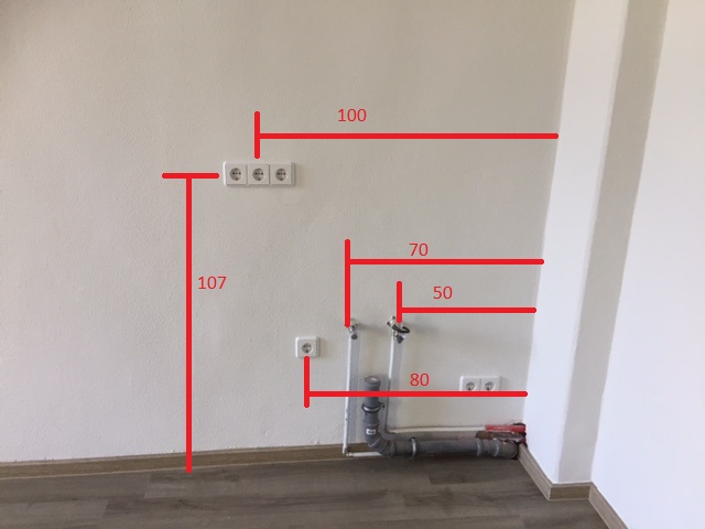 Leider war die Anschlussverlegung, so wie wir sie wollten, nun doch nicht möglich. Aussage der Vermietung: "Es wird nach Standard gemacht." Gestern konnten wir nun endlich ausmessen und das ganze Dilemma sehen (Fotos anbei).