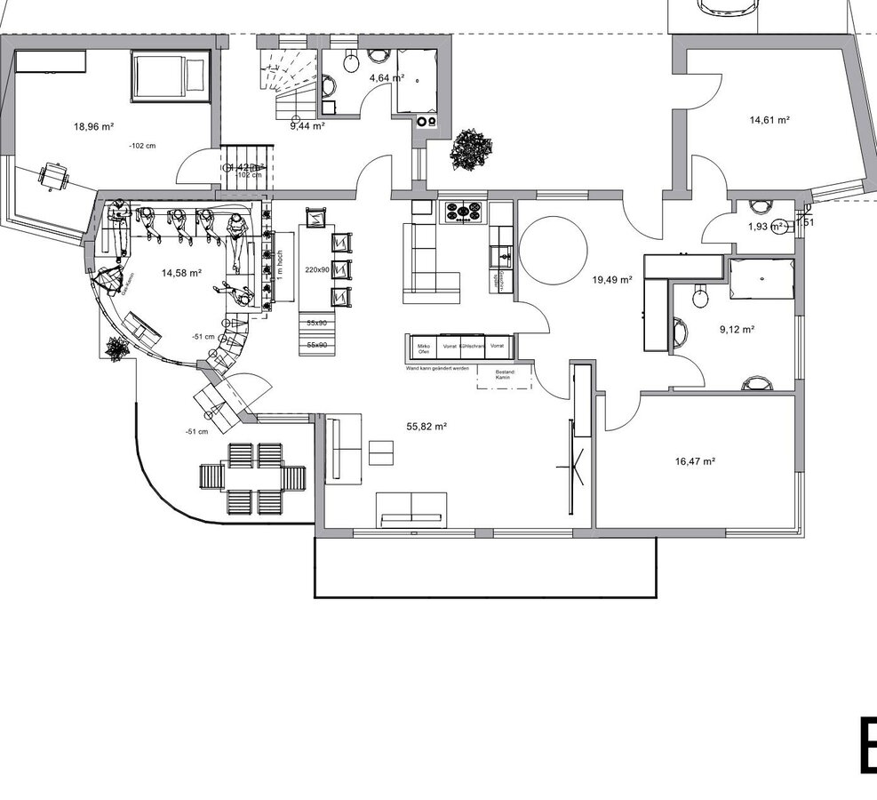 Die im Grundriss gezeichnete hellgraue Innenwand ist nicht tragend und kann geändert oder auch entfernt werden.