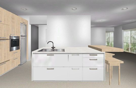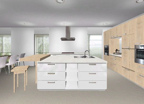 Die beiden Ecken habe ich tot geplant, Das KF könnte auch direkt neben den KS, dann würde die eine Ecke nicht so vollspritzen. Die Fensterseite hätte ich gern übertief, dann wird die freie Fläche in der Mitte auch etwas kleiner. Die Insel ist zum Arbeiten, auf der Eßzimmer-Seite würde ich die Arbeitsplatte etwas herausziehen, oder eine Theke aufsetzen, damit man dort auch mal "herumlungern" kann. Dort ist dann auch ein Zugang zum Garten. Auf dem Unterschrank über der Spüle würde ich die KüMa und den Mixer platzieren, die Kaffemaschine "woanders"?