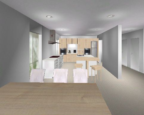 Sie hat oben eine Hochschrankwand eingeplant, links ein Vorratsschank, dann nur eine Tür als Blende und Durchgang in die Speis, dann Spüli mit Mikro und im letzten Schrank der BO. KS steht daneben. Das Ganze eingefasst in halbtiefen Trockenbau.