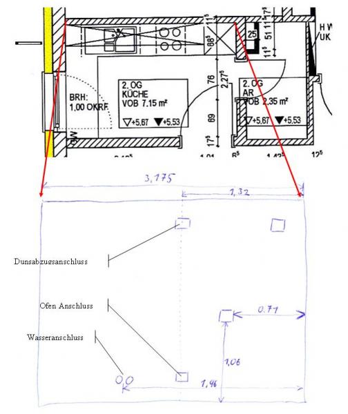 Das Maß von der rechten Wand bis zum Ofen Anschluss ist 1,32 m, und das Maß von der rechten Wand bis zur Mitte der Wasseranschlüsse ist 1,96 m. Nun mal ein paar Fragen dazu.