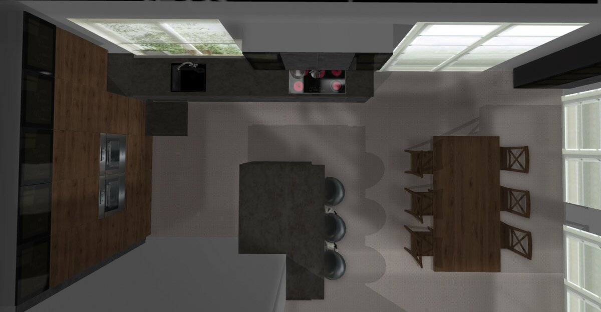 (...) Die Arbeitshalbinsel würde ich glaube ich auch nicht so weit raus ziehen. Es macht nichts, dass sie nicht so breit sein wird. 140 oder 150 cm ist aus meiner Sicht genau richtig, um 2 schöne Sitzplätze einzurichten. (...)