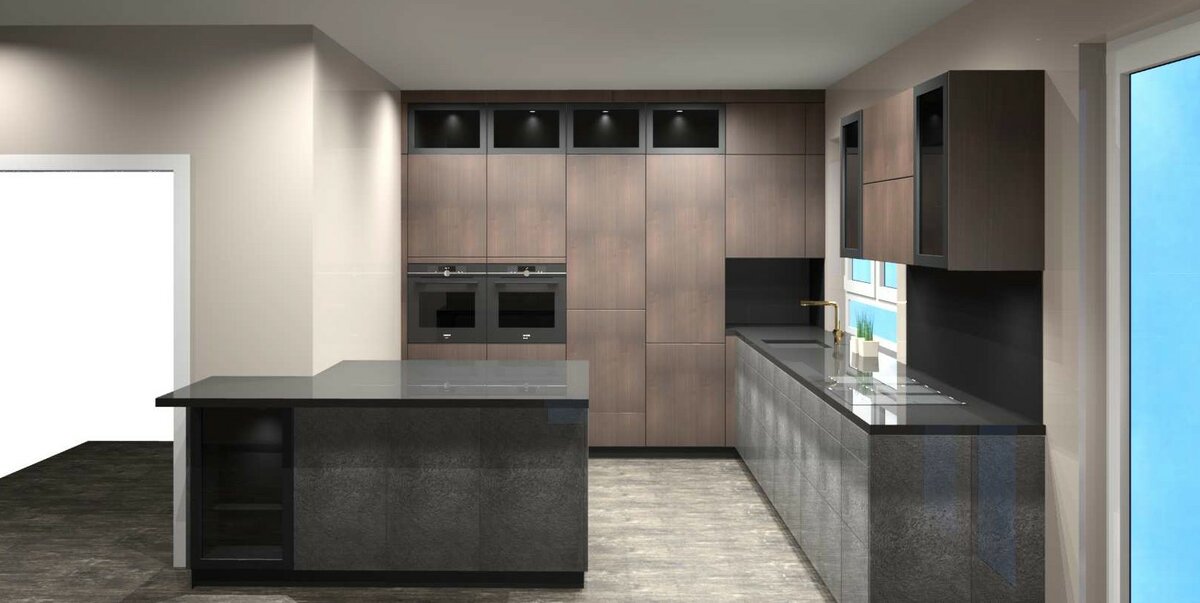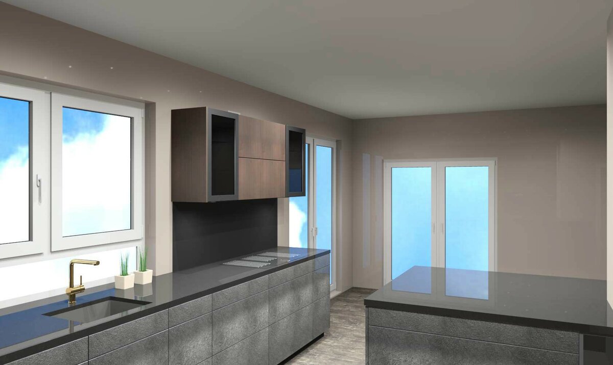 2. Farbe : Du hattest mein 3D-Ansicht gesehen? Da ist ja Holz und Schiefer kombiniert. Wir sind allerdings noch am Hin- und Her-Experimentieren, wie wir die Hochschrankwand (Holz) mit Glaselementen / -türen / - schränken etwas auflockern können, ohne dass wir auf Funktion und Platz verzichten müssen. So, wie es in der aktuellen 3D-Ansicht ist, mit Glasoberschränken in der obersten Reihe, wie ein KFB es vorgeschlagen hat, ist jedenfalls noch nicht der Weisheit letzter Schluss. Vielleicht hat jemand eine Idee?