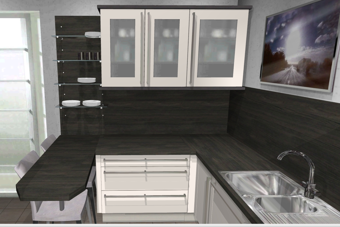Hallo Evelin, du hast völlig Recht mit den abgerundeten Kanten.Ich habe deinen Tip mit den berücksichtigt und diese entfernt. Stattdessen eine Nichenrückverkleidung über dem Ansetztisch gewählt. Sieht wesentlich moderner aus. In Realität sollen da aber nur drei Regalböden hinkommen bzw. die unterste höher angesetzt werden, damit diese beim sitzen nicht stört.
