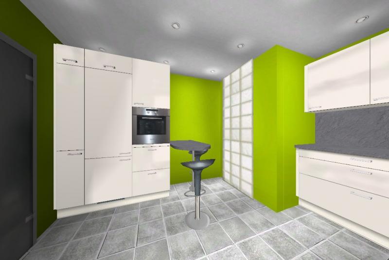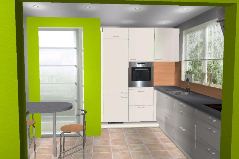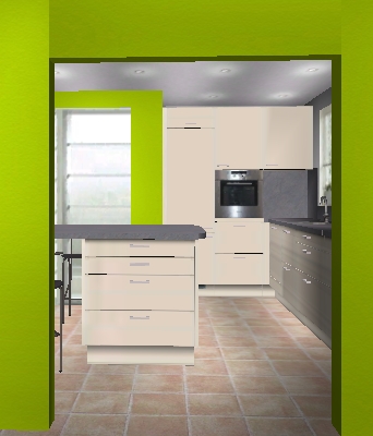 Das ist der ursprüngliche Plan. Die Terassentüre lässt sich nciht mehr ganz öffnen, aber das stört nicht. die Platzierung des Backofens stört mich ein bisschen, da ich es gerade in dem Eck mit den zwei Hochschränken sehr eng finde, außerdem ist das Eck damit sehr verbaut. So würde es von vorne aussehen: