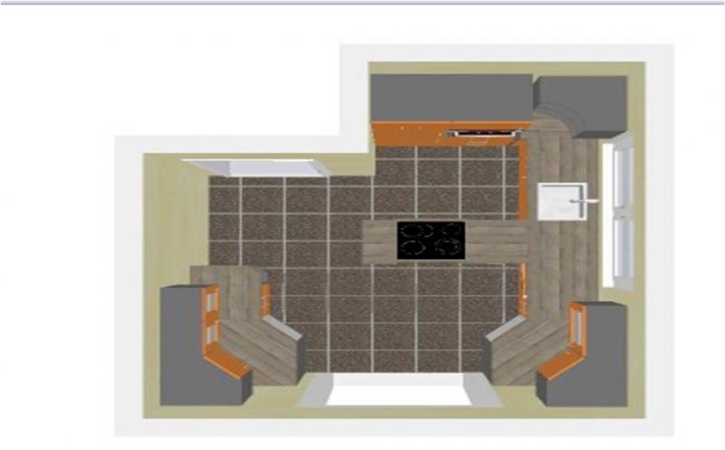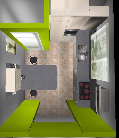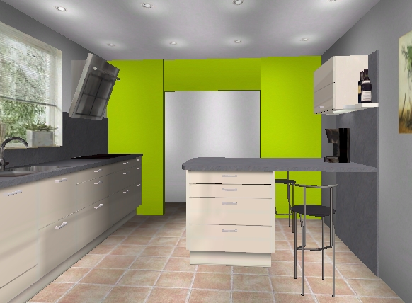 Ich habe mal noch eine richtig große Halbinsel dazugepackt. Die könnte da eher stören und als Barriere gelten. Wäre aber gut erreichbarer Arbeitsplatz sowohl von Spüle als auch vom Kochfeld und bietet 2 dicke Sitzplätze.