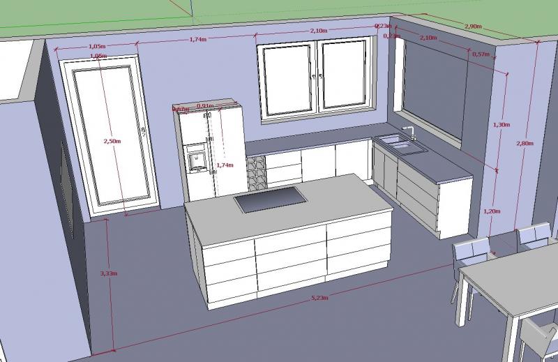 Der Side by Side Kühlschrank ist schon da, deshalb soll er auch weiter verwendet werden. Die Positionierung hat mir Kopfzerbrechen bereitet, ich bin mit der Position nicht zufrieden, da er die Terassentür "erschlägt". Bedingt durch die Raumhöhe von 280cm habe ich keine Dunstanzugshaube an der Decke vorgesehen, lässt sich da was in der Kochinsel realisieren?