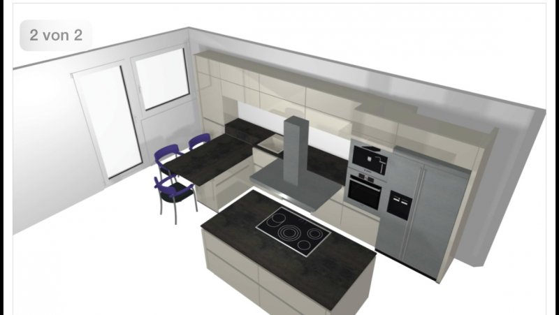 Ich habe in der Mitte keinen Wasseranschluss, das ist schlecht. Und ich möchte einen richtigen Tisch haben mit normalen Stühlen. Sonst ist kein anderer Essplatz vorhanden und immer nur auf Barkockern zu sitzen finde ich nicht so gut. Ansonsten finde ich einen Zweizeiler mit Insel superschön.