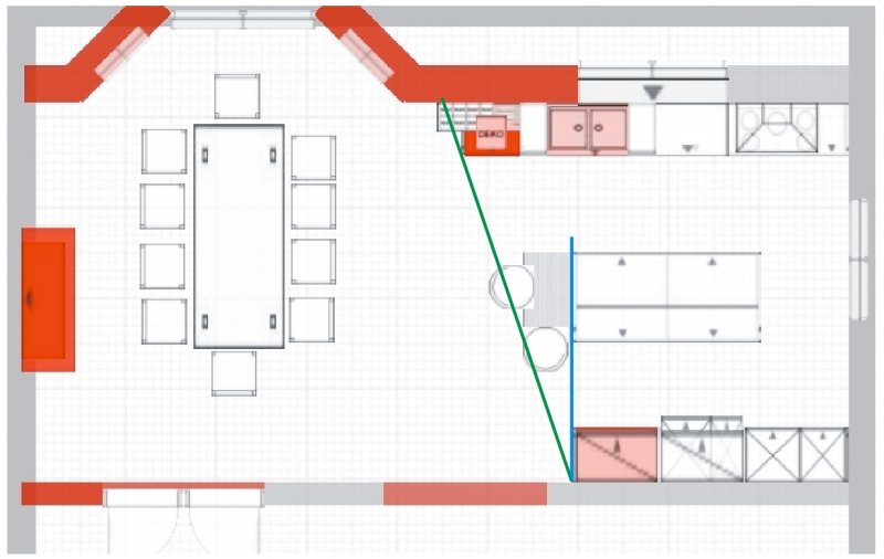 Obwohl der Raum 40 m² hat bleiben durch den 180cm großen Durchgang, für die Küche effektiv nur knapp 14 m². Die Küche sollte wegen der Optik auch auf der Linie des Durchgangs enden.