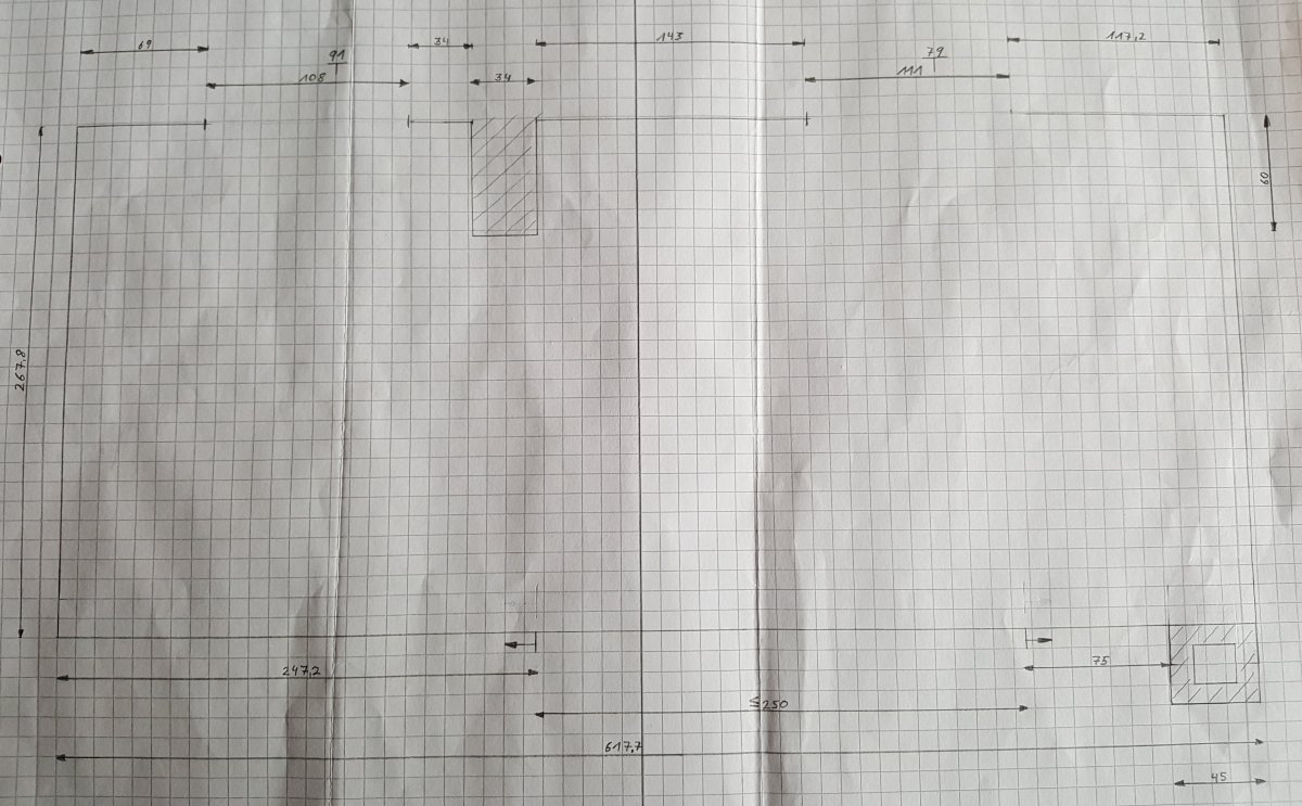 Problematisch ist, dass die beiden Fenster unterschiedlich groß sind und vor allem eine unterschiedliche Brüstungshöhe (91 cm und 79 cm) haben. Daher habe ich erstmal versucht so zu planen, dass keine Arbeitsfläche am Fenster benötigt wird. Die Fenster sollen möglichst auch nicht verändert werden, da sonst das Außenbild des Hauses gestört ist.