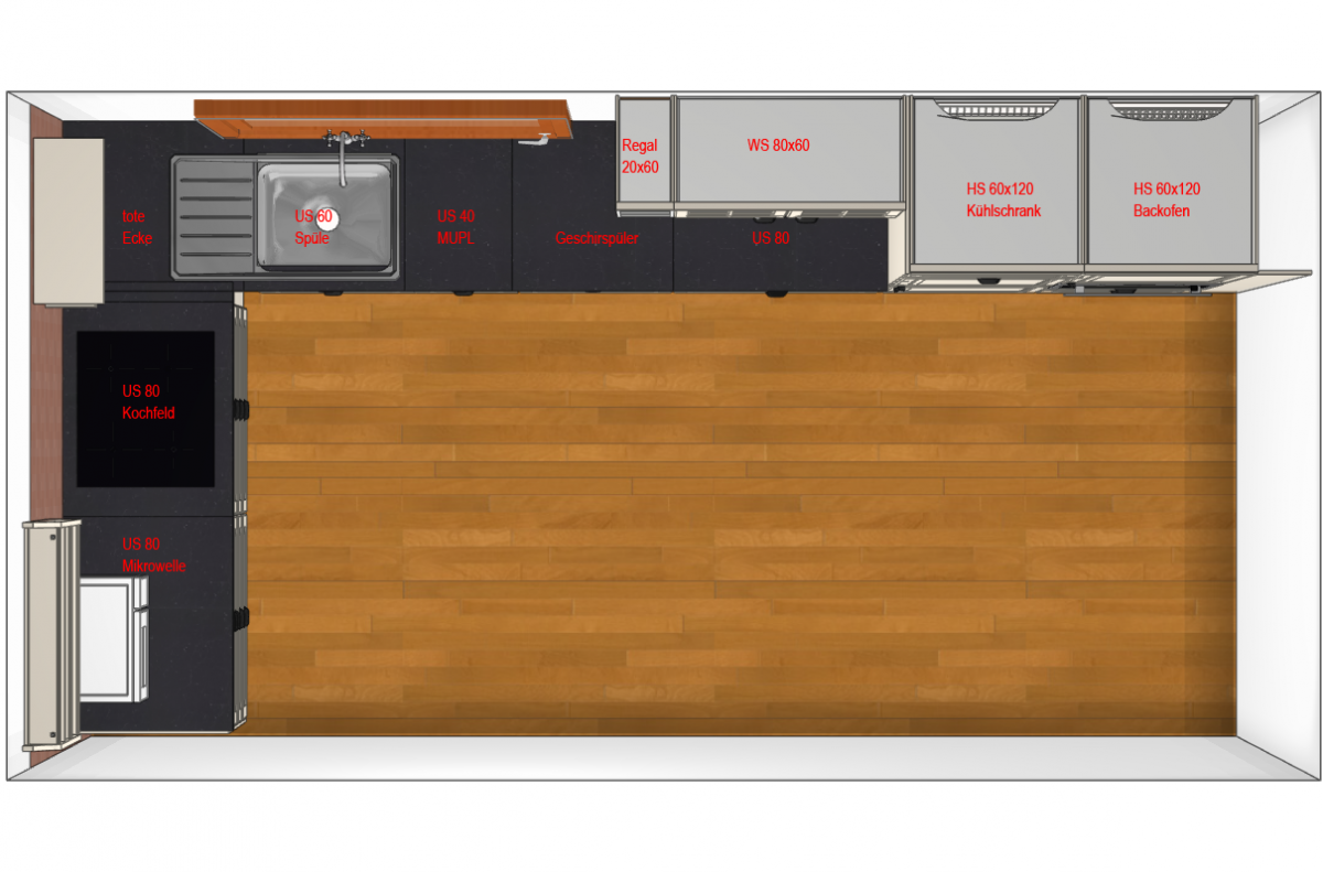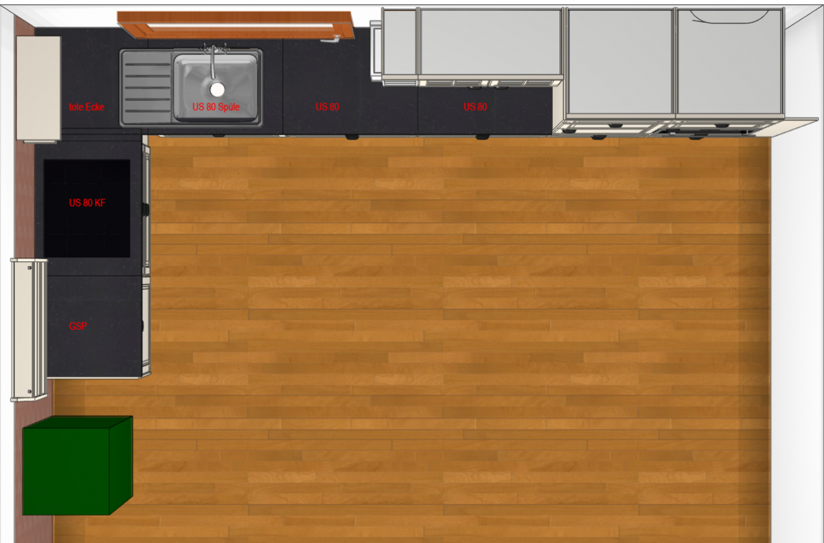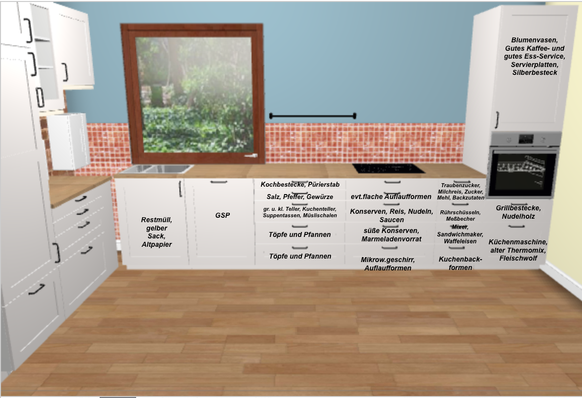 Den Kühlschrank fand ich in deinem Plan viel zu hoch, da kommt man ja an die oberen Fächer gar nicht mehr ran. Daher bei mir nur zwei Auszüge darunter.