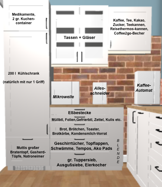 Den Kaffevollautomaten stelle ich mir auf der GSM vor, die Oberschränke habe ich erst ab einer Hähe von 160 cm geplant