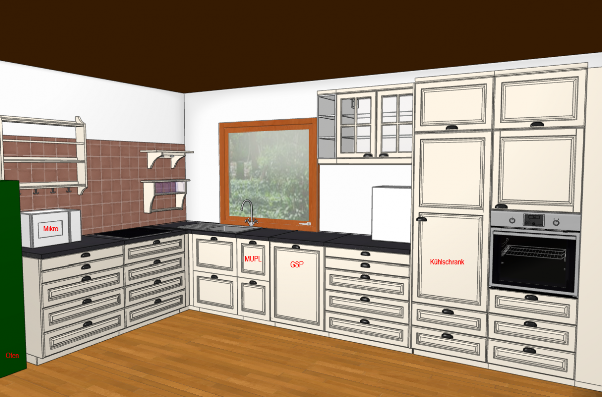 Nach ausgiebigem Hin- und Her (=dass der Kachelofen zwar bleibt - als Schmuckstück, aber NICHT befeuert wird - ich reagiere allergisch auf Verbrennungsgeruch), und ich Arbeitsfläche zwischen Spüle und Kochfeld haben möchte, ist dies nun Stand der Dinge: