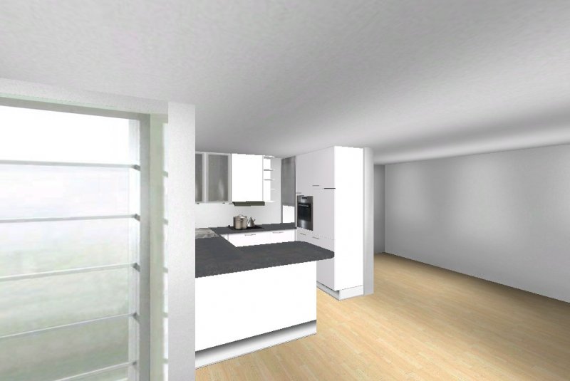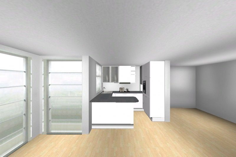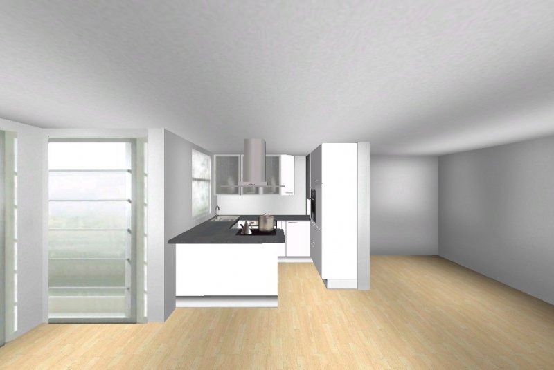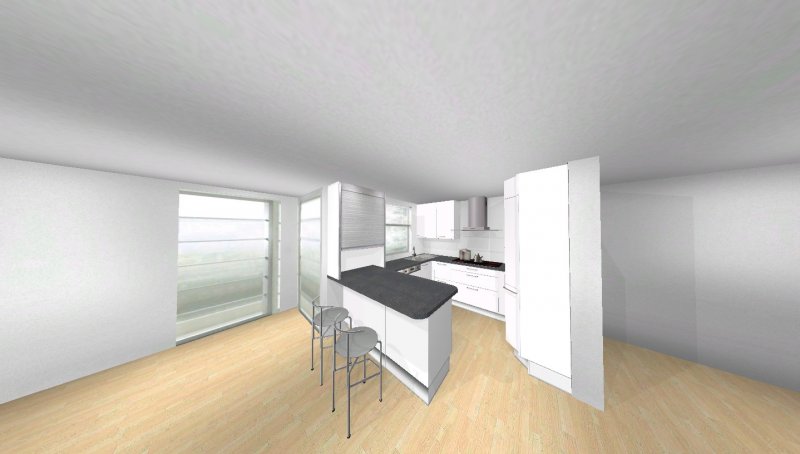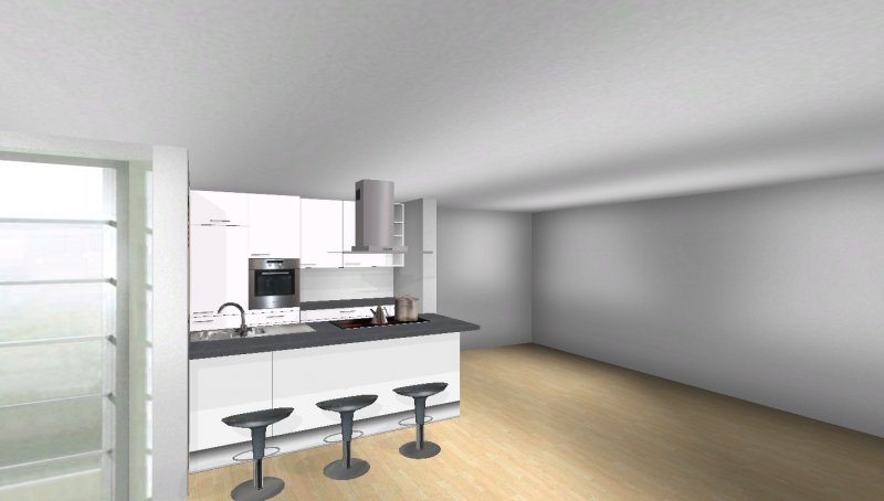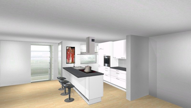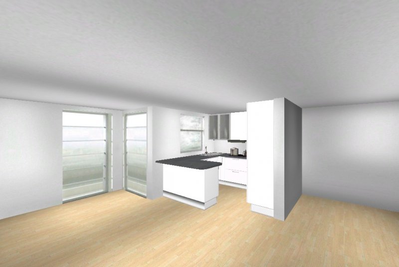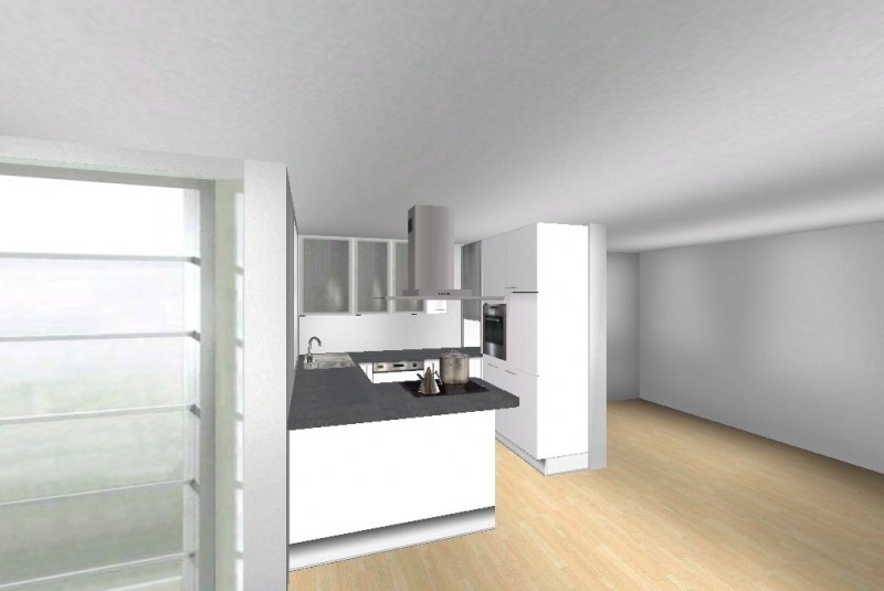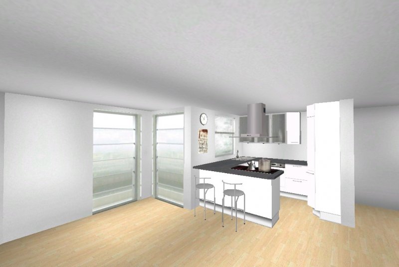 Grundsätzlich soll es eine moderne, weiß-matte Küche mit Metall- und Milchglaselementen werden - im Prinzip optisch wie in meinen Planungsvorschlägen. Es ist eine offene Küche, Pläne habe ich beigefügt. Etwas unklar ist noch der Einfluss des Versorgungsschachts im rechten hinteren Eck der Küche - da es sich um die DG-Wohnung handelt könnte ich mir vorstellen, dass er auch unter der Höhe der Arbeitssfläche enden könnte. Jetzt will ich aber nicht durch lange Einführungstexte langweilen und präsentiere mal meine drei Planungsvorschläge ;-):