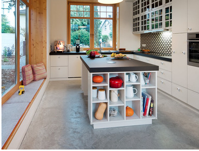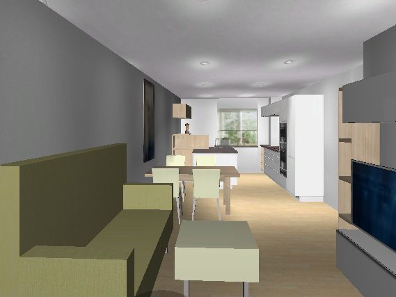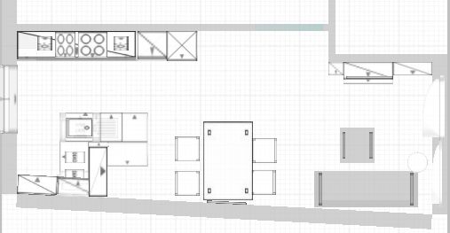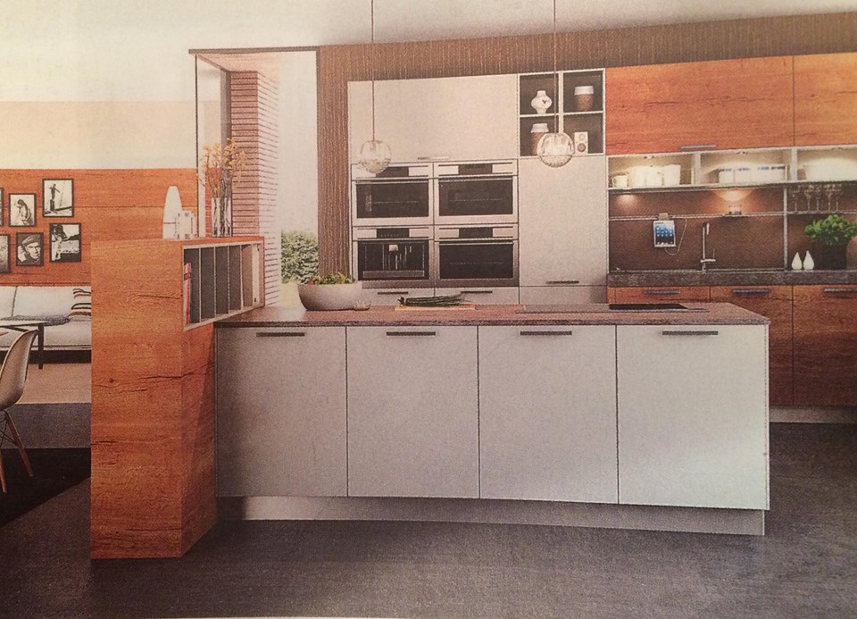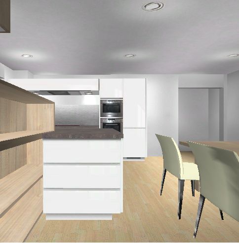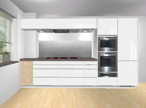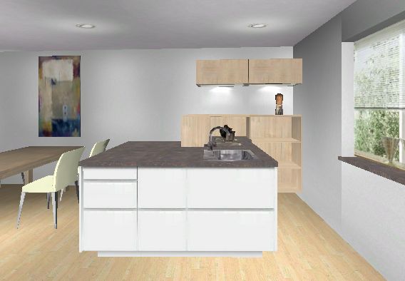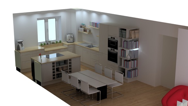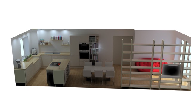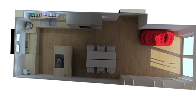 Es geht mir um das Holzregal links der vorderen Küchenzeile. Was mir daran gefällt: Das Versprechen auf Wohnlichkeit. Da wir einen Wohnessraum haben, hätte ich in der Küche – trotz aller praktischer Überlegungen – gerne auch etwas Gemütlichkeit. Die entstehen für mich z.B durch Holz und Bücher (und mit meinen Kochbüchern könnte ich einige Regalmeter füllen). Bei uns stände so ein Regal natürlich an der Wand planlinks, weshalb man die Rückseite nicht für weitere Fächer nutzen kann (wie ich es hier im Bild vermute). Was klar war: Durch die Kochhalbinsel geht ein wenig Fläche verloren (ich dachte mir, dass man aber ja das eine Regal auch so planen kann, dass man von der Küchenzeile aus daran kommt, und den Verlust so möglichst gering hält.) Als ich mich ans Zeichnen machte, zeigte sich aber vor allem ein anderes Problem: Das Fenster ist "im Weg". Ich habe trotzdem mal weitergemacht. In der Vogelperspektive sieht man: Die Arbeitsfläche der Insel ist entsprechend angeglichen – darunter entstünde eine kleine Nische, die man aber sicherlich genutzt bekäme. Darauf könnte man z.B. auch die Getreidemühle stellen. Mir stellt sich die Frage nach der Optik und sonstigen Praktikabilität. Außerdem: die genauen Maße des Fensters stehen meines Wissens noch nicht fest (darauf spekuliere ich auch für die Höhe) – aber diese Planungsgespräche stehen erst noch an. Ich habe das Fenster jetzt erstmal so genommen, wie es im Plan steht.