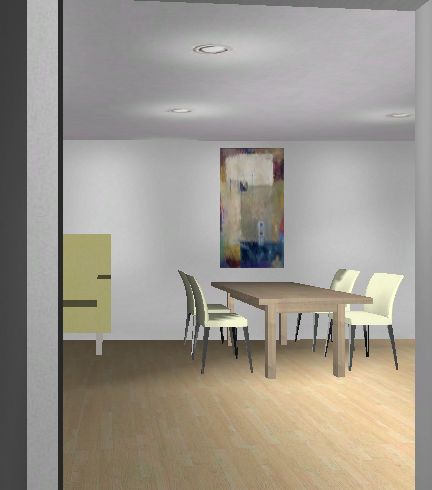 Der Tisch ist – nicht ausgezogen – 160cmx100cm, die Stühle hab ich jetzt 50cmx50cm geplant. Sitzt niemand am Tisch, werden sie natürlich angeschoben. Ausgezogen (gestrichelt) ist er 210cmx100cm (müsste noch etwas anders platziert werden). Wohnzimmersofa hab ich unser jetziges eingezeichnet (209cmx100cm) und als Regal erstmal das Expedit (acht Fächer), was wir längs auf dem Boden stehen haben, darauf ist der Fernseher. Solange noch nicht beide Kinderzimmer belegt sind, werden wir ein Arbeitszimmer haben und dort viele Bücher stellen können – das wandfüllende Regale würden wir erst benötigen, wenn ein zweites Kind da ist.