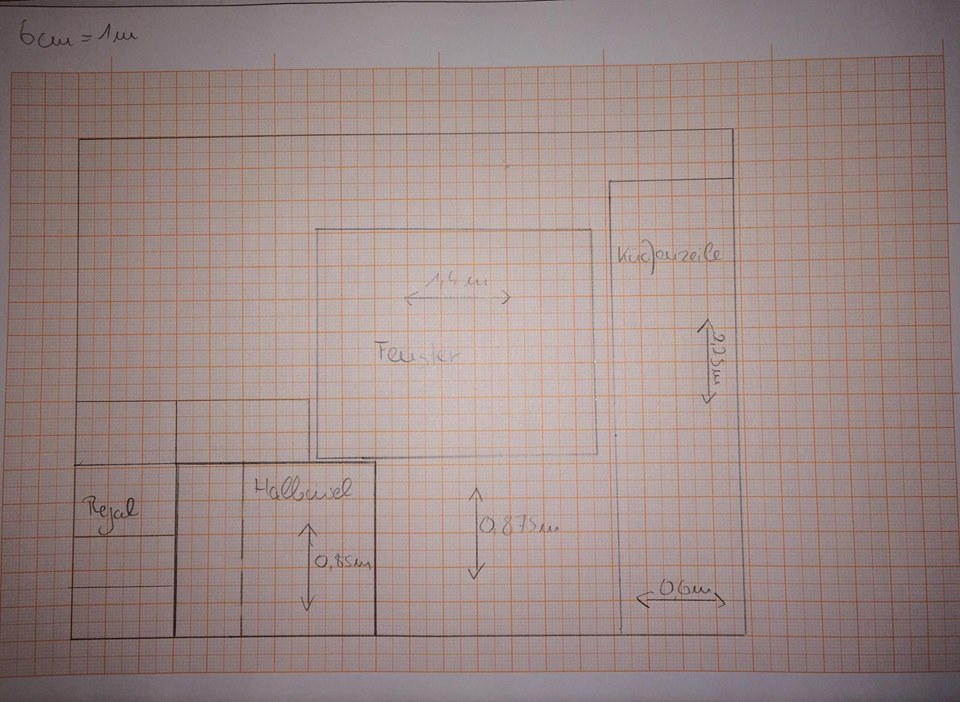 Das Regal geht auf meiner Zeichnung bis zum Fenster – etwa 120cm und ist etwa 30cm tief (hier scheine ich etwas zu knapp gemalt zu haben).