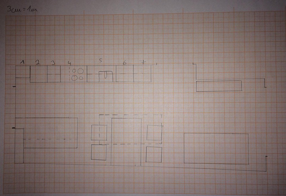 Die Halbinsel ist (ohne das Zusatzstück vorm Fenster) 180cmx90cm (scheint mir auf der Zeichnung etwas zu breit geworden sein) und wäre die Arbeitsfläche. Die Schubladen zur Wand hin hätte ich gerne ca. 30cm lang, die zur Kochzeile ca. 60cm. In den kleinen Schubladen könnte man Dinge verstauen, die man immer mal wieder, aber nicht ständig zum Kochen braucht (Marsala, Wermut usw., Gewürzvorräte, Zubehör für die Küchenmaschinen, Backutensilien...).