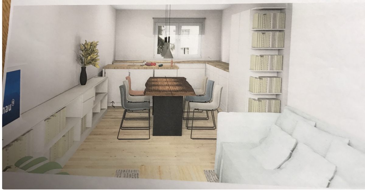 Stauraum: Für die Küchensachen sollte in der Küche natürlich genug Platz sein, aber da mache ich mir wie gesagt wenig Sorgen. Ansonsten haben wir den restlichen Raum mit einem Inneneinrichter besprochen und bewusst "luftig" geplant – so gut das eben auf so einer Fläche möglich ist. Das heißt, auch im Wohnbereich haben wir keine hohen Regale, sondern nur ein langes Sideboard. Erstmal werden wir mit der restlichen Fläche gut auskommen (zumal wir Wegschmeißer sind). Wenn wir dann in ein paar Jahren merken, dass die Wohnung für zwei, drei oder vier zu eng wird, ziehen wir um. Die Wohnung werden wir problemlos vermieten können.