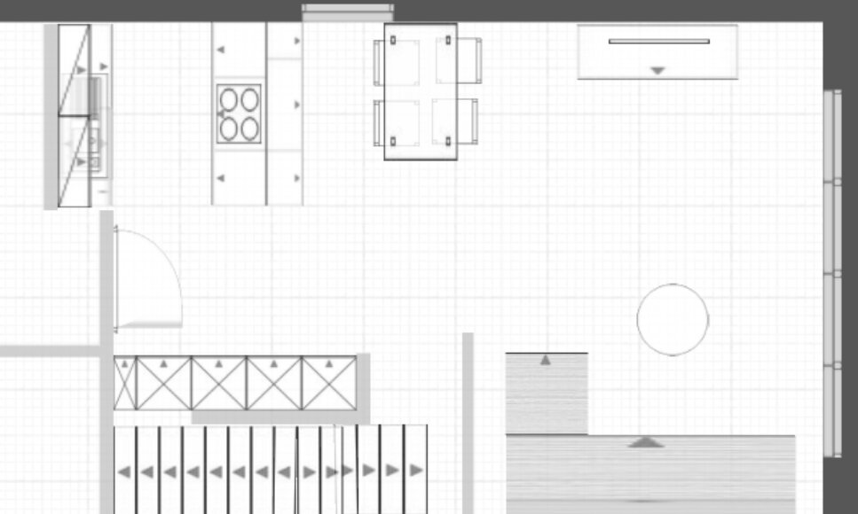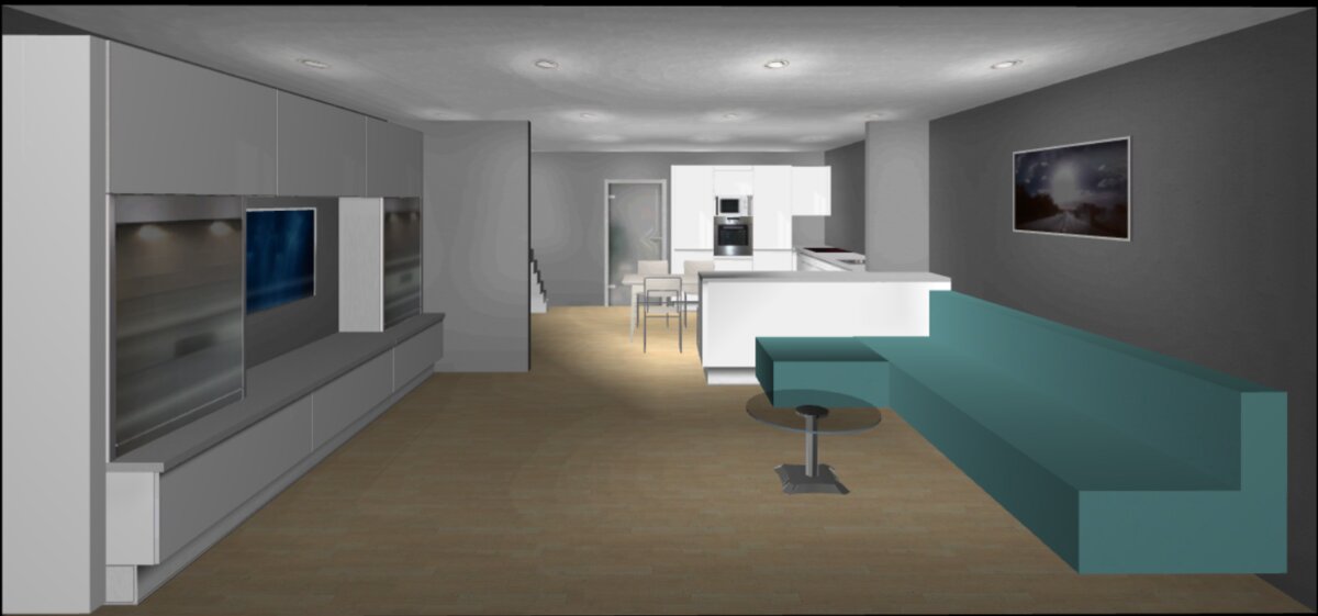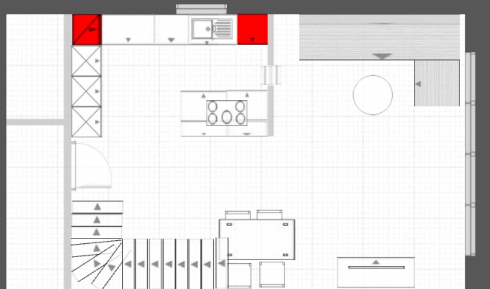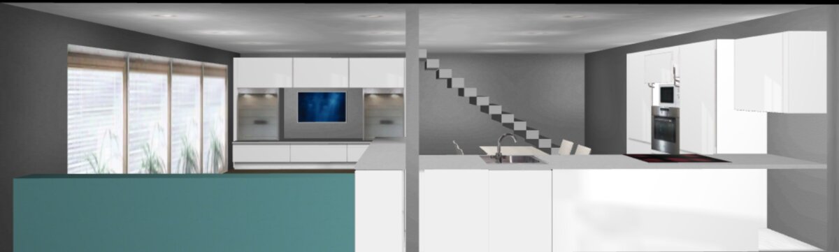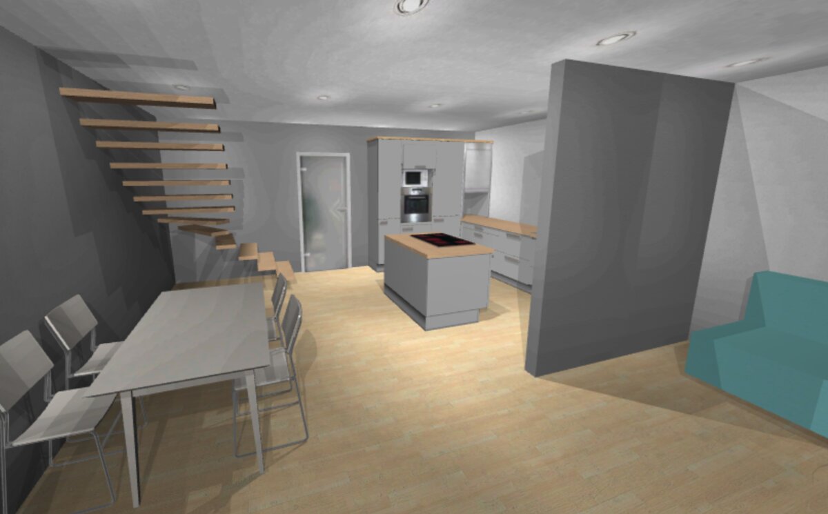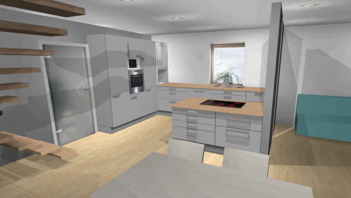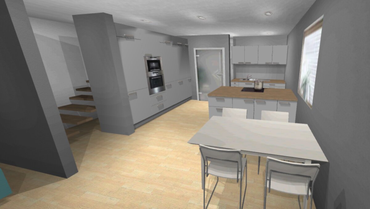 + Die Treppenseite würde mit geschlossener Küchen-Schrankwand effektiv genutzt werden können.