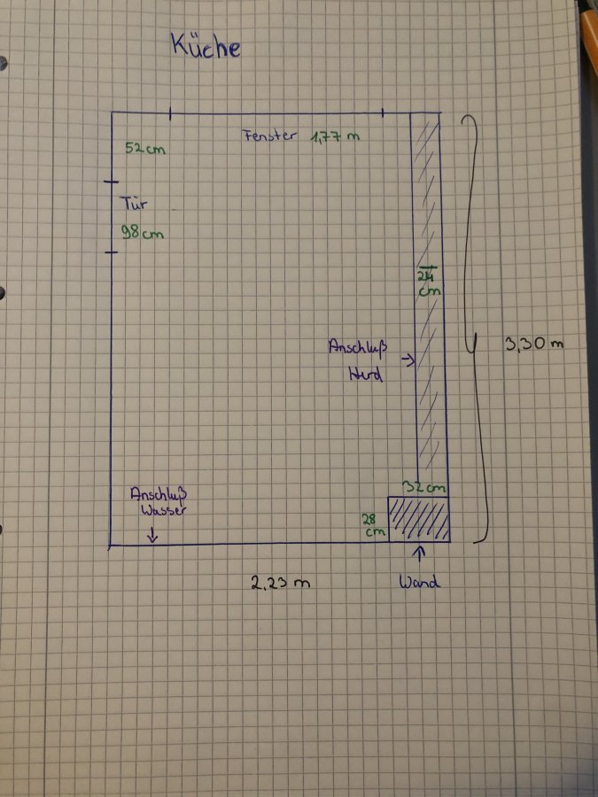 Ich habe eine Skizze angefertigt mit den Maßen. Das Problem an der Küche sie ist klein und in der Ecke ist eine Wand vom Kamin das wiederum den Platz wegnimmt. Und an der Wand wo der Herd Anschluss ist gibt es noch einen Vorsprung von 24. cm. Mit Fliesen. Ich weiß nicht ob man es versteht. Die Arbeitsplatte muss dadurch breiter sein. Backofen und Spülmaschine möchte ich behalten. Es sind Standards. Der Kühlschrank kann dann irgendwo im Raum stehen. Es geht mir nur um die Planung damit mehr Stauraum ist oder es hübscher aussieht. Ich weiß nicht wie ich alles kombinieren soll. Vielen Dank für die Hilfe.