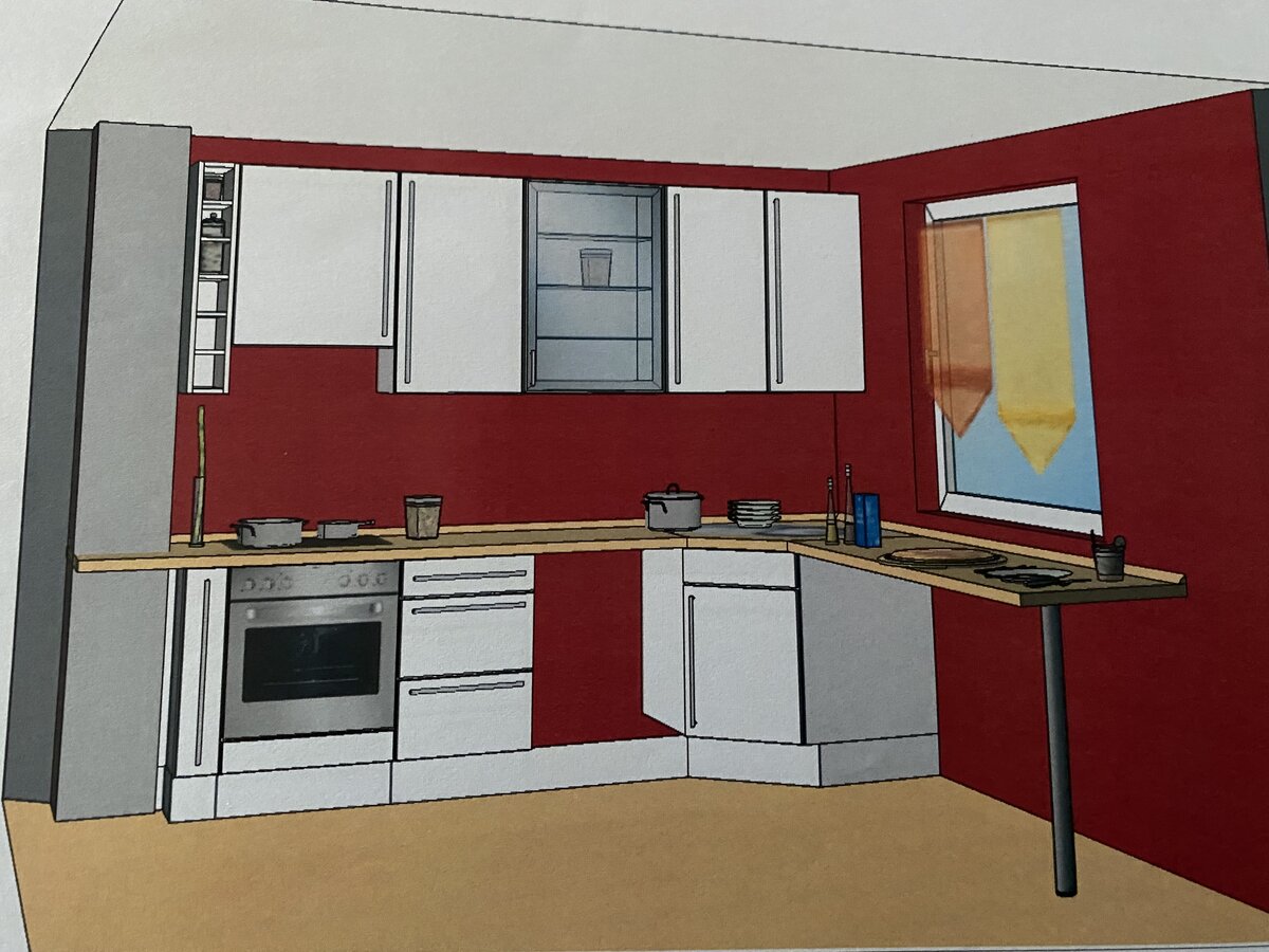 Update: im zweiten Anhang die jetzige Planung. Rechts am Ende der Arbeitsplatte steht der Kühlschrank, daneben unter der Platte haben wir schon selber einen Schrank dazugekauft, mehr geht da leider nicht wegen der Heizung.