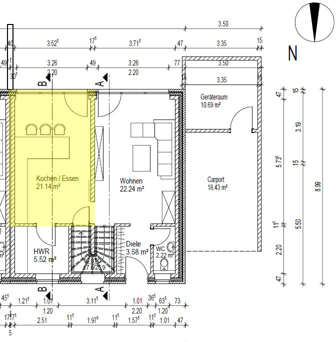 Im Anhang findet ihr einen Grundriss des Erdgeschosses auf dem ich den Küchen-/Essbereich gelb markiert habe.