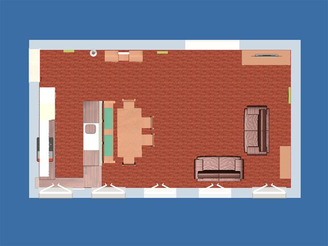Auch wg. Fernsehgucken hatte ich deshalb hier den Fernseher ganz links an der Wand gedacht. Von den Sofas kann man dann gemütlich gucken, von der Essgruppe sieht man auch noch etwas und von der Arbeitsinsel (da könnte ja auch die Spüle mit hin) kann man den Fernseher auch sehen. Außerdem sind beide bodentiefen Ausgänge auf die Terrasse/Balkon nutzbar. Man kommt auch bequem aus dem Küchenarbeitsbereich dorthin, z. B., weil dort Kräutertöpfe sind.