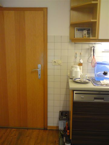 4) Zwischen dem rechten Fenster und dem Kellerverlies steht aktuell ein Vorratsschrank, 20 cm tief, der dort gerade so hinpasst. Den würde ich nur mit neueren Türen aufhübschen, da er an sich ganz praktisch ist - außer ihr habt noch viel bessere Ideen... *hoffnungsvoll guck*
