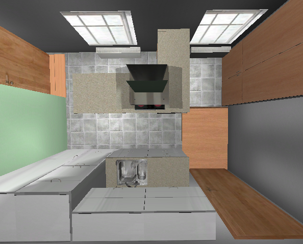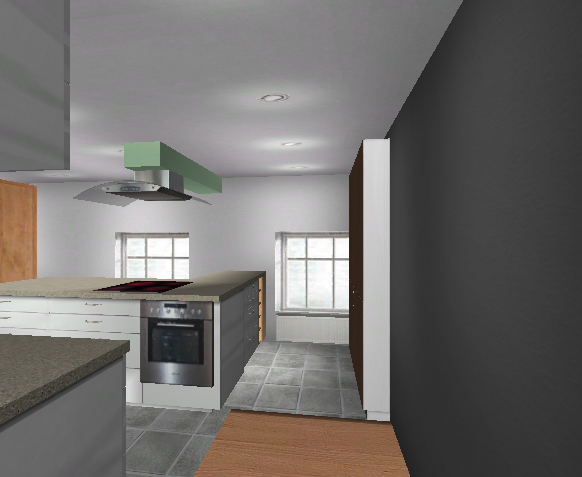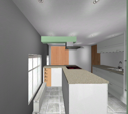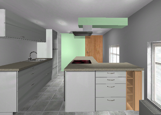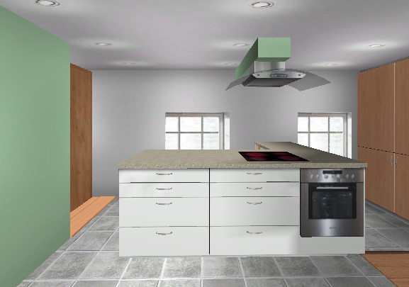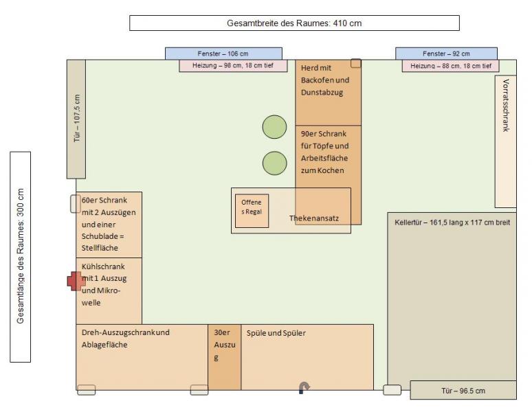 und, was du vergessen hast, die Insel müßte mit einer ca. 20 cm breiten Blende an der Wand beginnen, denn so kannst du keinen Backofen etc. bedienen, da die in den Raum stehende Heizung im Weg ist.