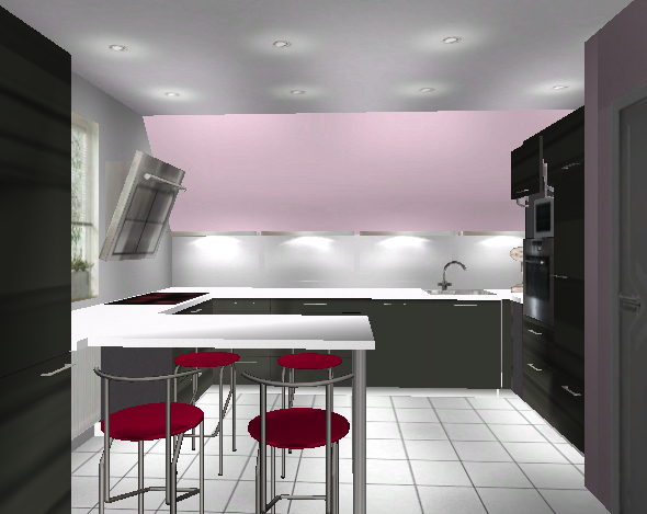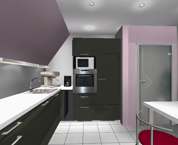 Ich habe auch ganz frech den Wasseranschluss umgelegt, tauschen von Kochfeld und Spüle wäre auch denkbar. Durch die große Fläche gleich rechts an der Tür (Halbinsel) hat man auf der Seite mit der Schrägen fast beliebig viel Spielraum. Auch z.B. um noch einen 140er (halbhohen) Schrank für den hoch gebauten Backofen unterzubringen.