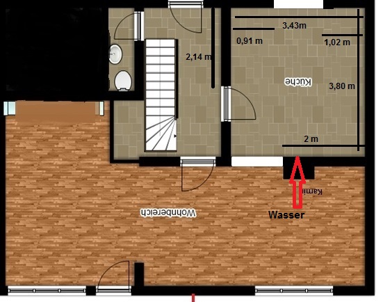 Ich würde dann die ganze Wand hinter den Schränken mit Rigips verkleiden, damit man die Schränke nicht noch weiter in die Küche ziehen muss.