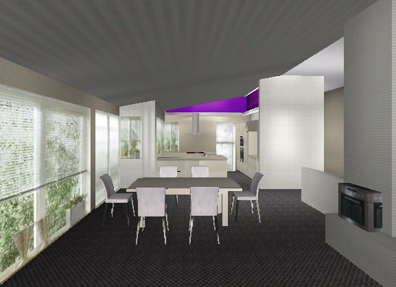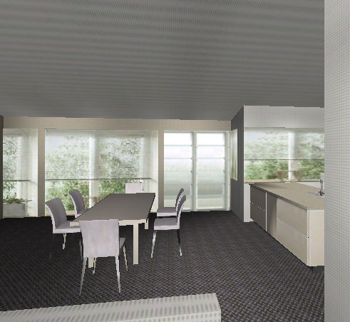 Über den Hochschränken sind Fenster vorgesehen, ein Oberlicht ist aus statischen Gründen nur im Bereich des Wohnzimmers möglich.