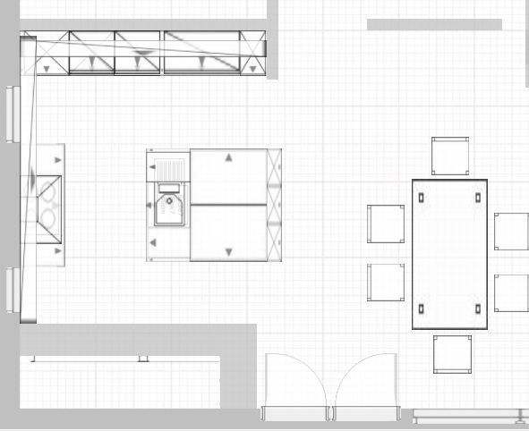 Die Insel kann in der Breite etwas optimiert werden. Rechts (vom Wohnbereich) bietet sich das Türmaß von 88,5 als Durchgang an, das ergäbe eine gute und erkennbare Linienführung. Links könnten 10-15cm mehr möglich sein. Insgesamt wären kompakte 160cm Breite realistisch und dann als Koc-und Vorbereitungsinsel brauchbar.