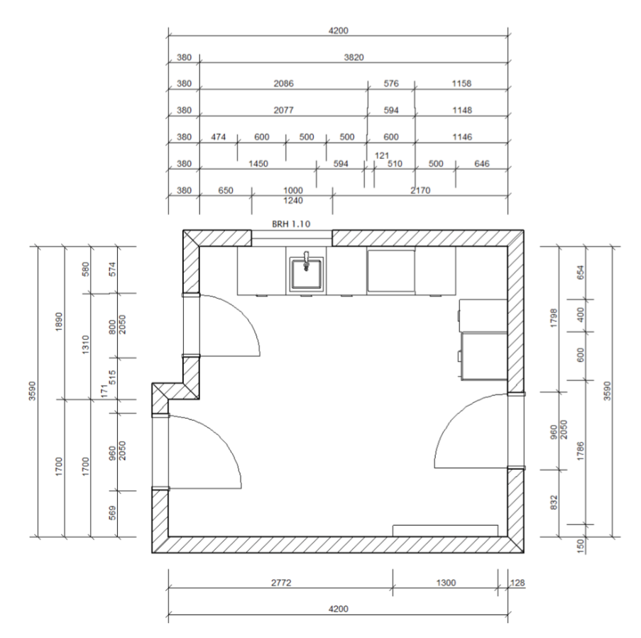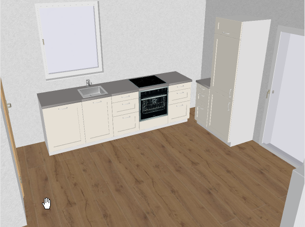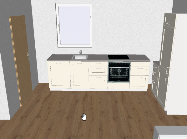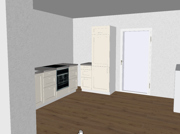 Mit den vorhandenen Möbeln (ein 60er-Unterschrank , ein 45er-Besenhochschrank und ein in der Tiefe gekürzter 50er-Vorratshochschrank sind nicht berücksichtigt) habe ich mal eine Planung angefangen, aber es fehlt einfach an Arbeitsfläche. Zudem fehlen zwischen Kühlschrank rechts und einem Lichtschalter ca. 5-10mm Platz. Und wenn ich zwischen Herd und Spüle etwas Arbeitsfläche einplane, liegen die Wasseranschlüsse nicht mehr hinter der Spüle. Einen Gasanschluss für den Herd können wir uns flexibel legen lassen. Links ist eine Tür zur Speisekammer, die 57 cm von der Wand entfernt liegt, d.h. hier kann keine normal breite Arbeitsfläche installiert werden.