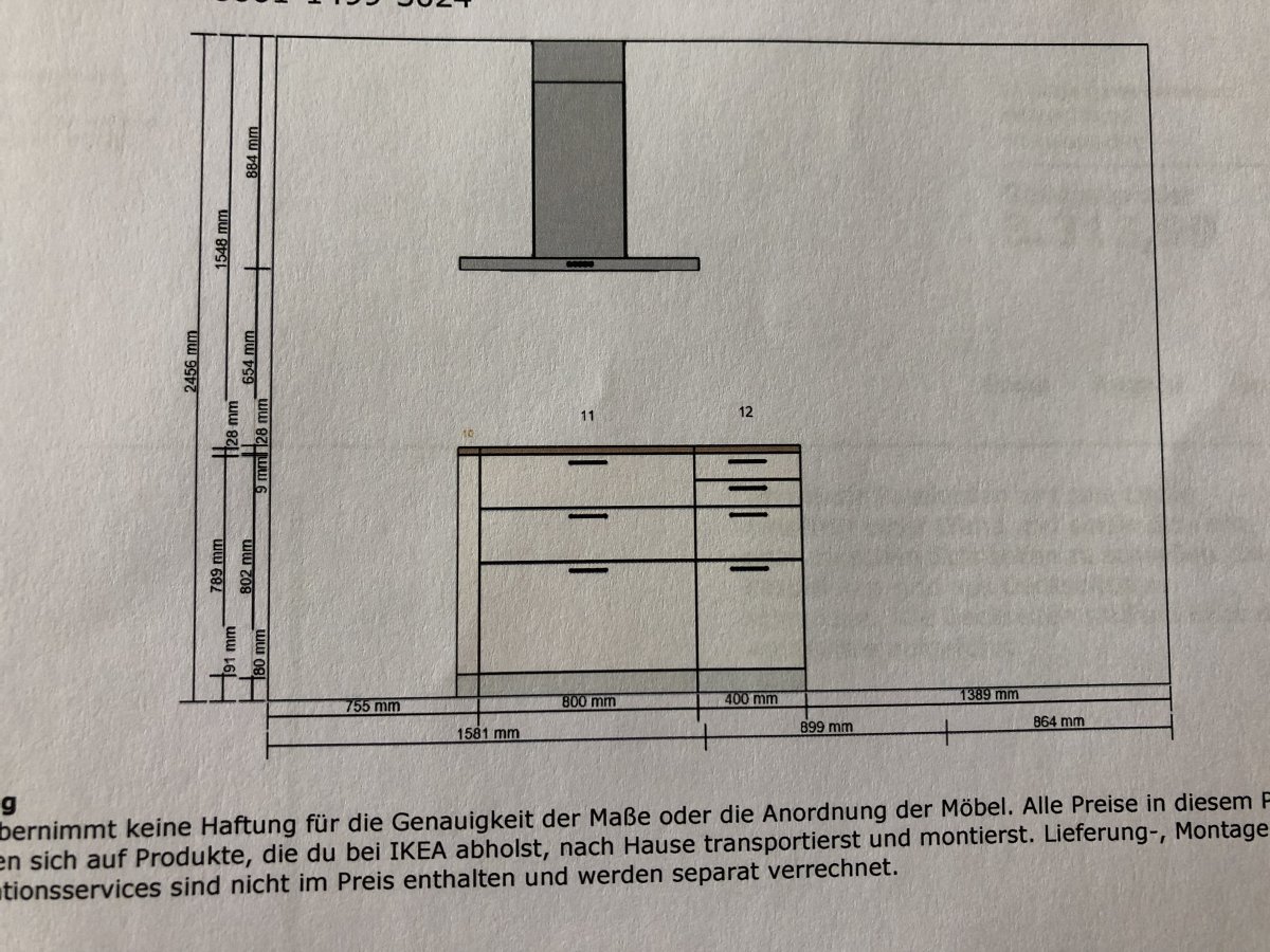 So nach langem Überlegen und hin und her ist der aktuelle Stand, dass wir den Heizkörper entfernen lassen und doch noch schauen ob ein Muldenlüfter nicht die bessere Alternative zur Deckenhaube ist. Kernbohrung machen lassen dürfen wir. Vom dritten Hochschrank haben wir uns zugunsten von mehr Arbeitsfläche verabschiedet.