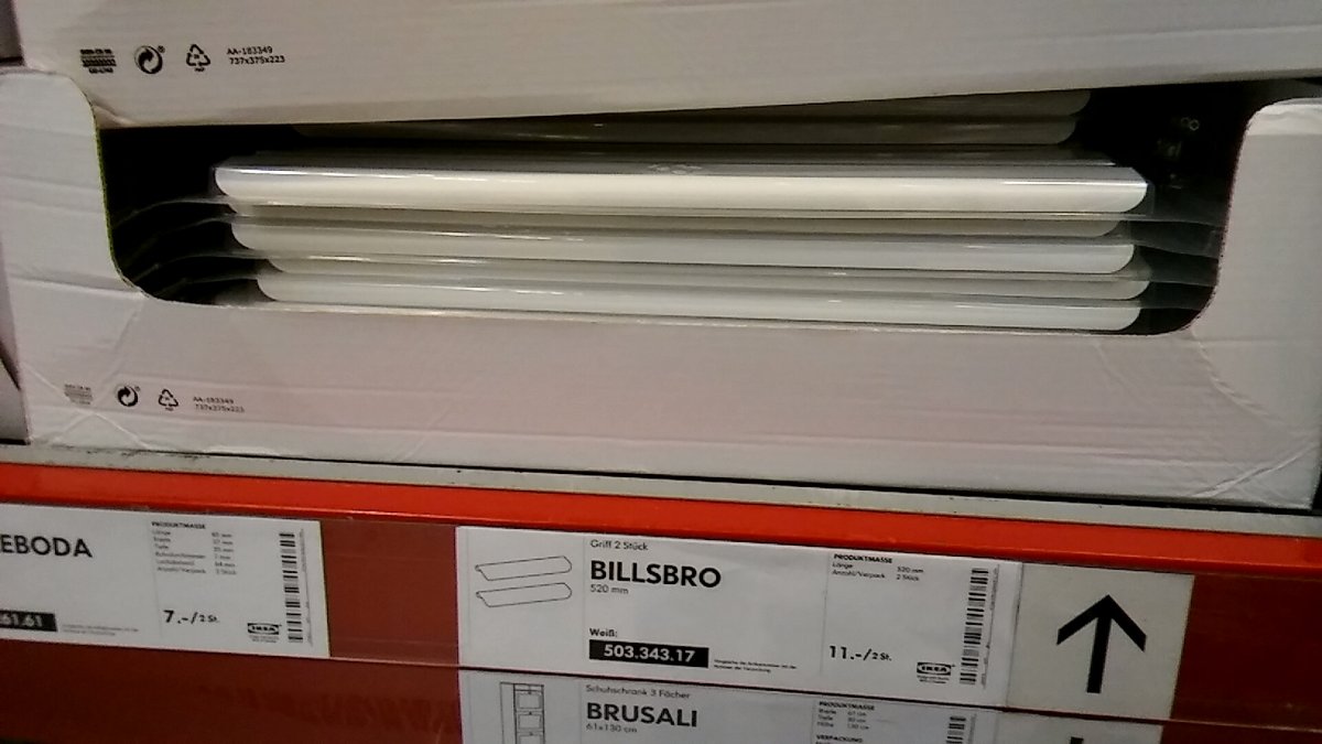 Ich habe jetzt bei so-tech weiß eloxierte Aufsatzgriffe in 150mm Länge für alle Schränke gekauft. Kosten 1.90 pro Stück. Sollten die nicht gefallen,kann man später Billsbro nachrüsten in passenden Längen.