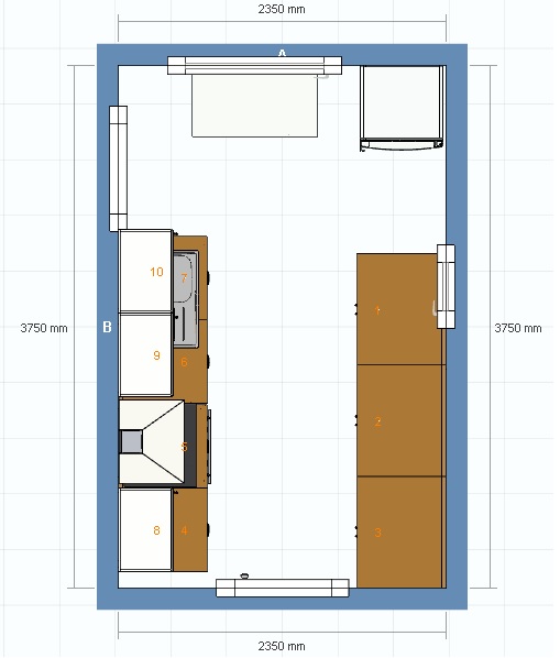 Im Anhang sind die benötigten Grundrisse sowie meine aktuelle Planung. Kopfschmerzen macht mir der Schubladenschrank links neben der Tür. Wenn ich die Tür immer auf und zu mache, hänge ich mit der Tür bestimmt irgendwann vor einer offenen Schublade, oder?